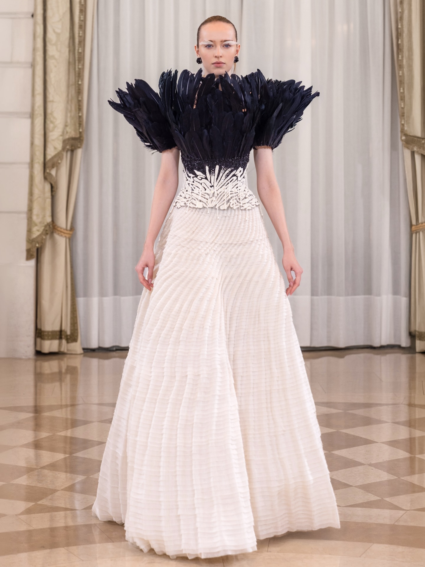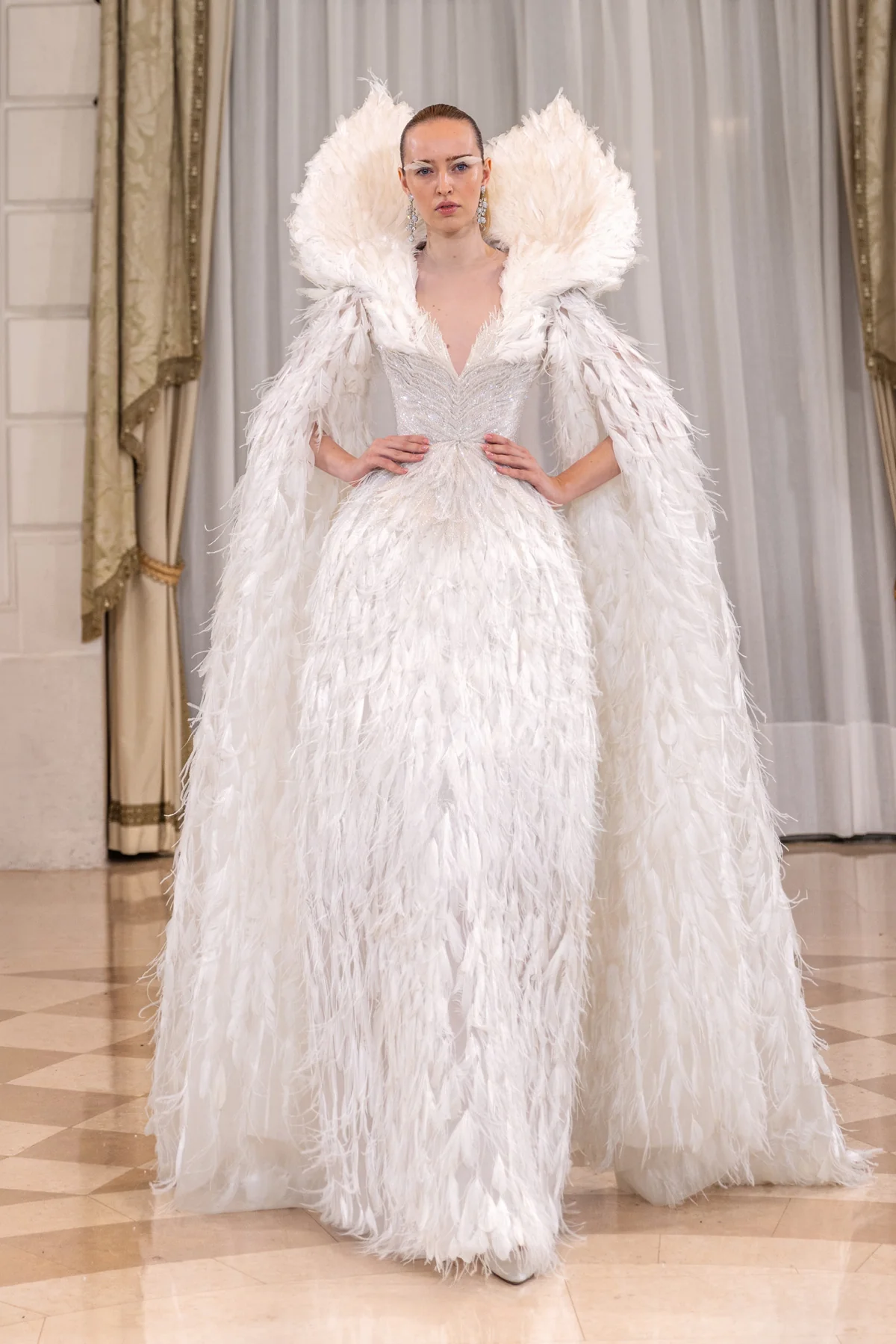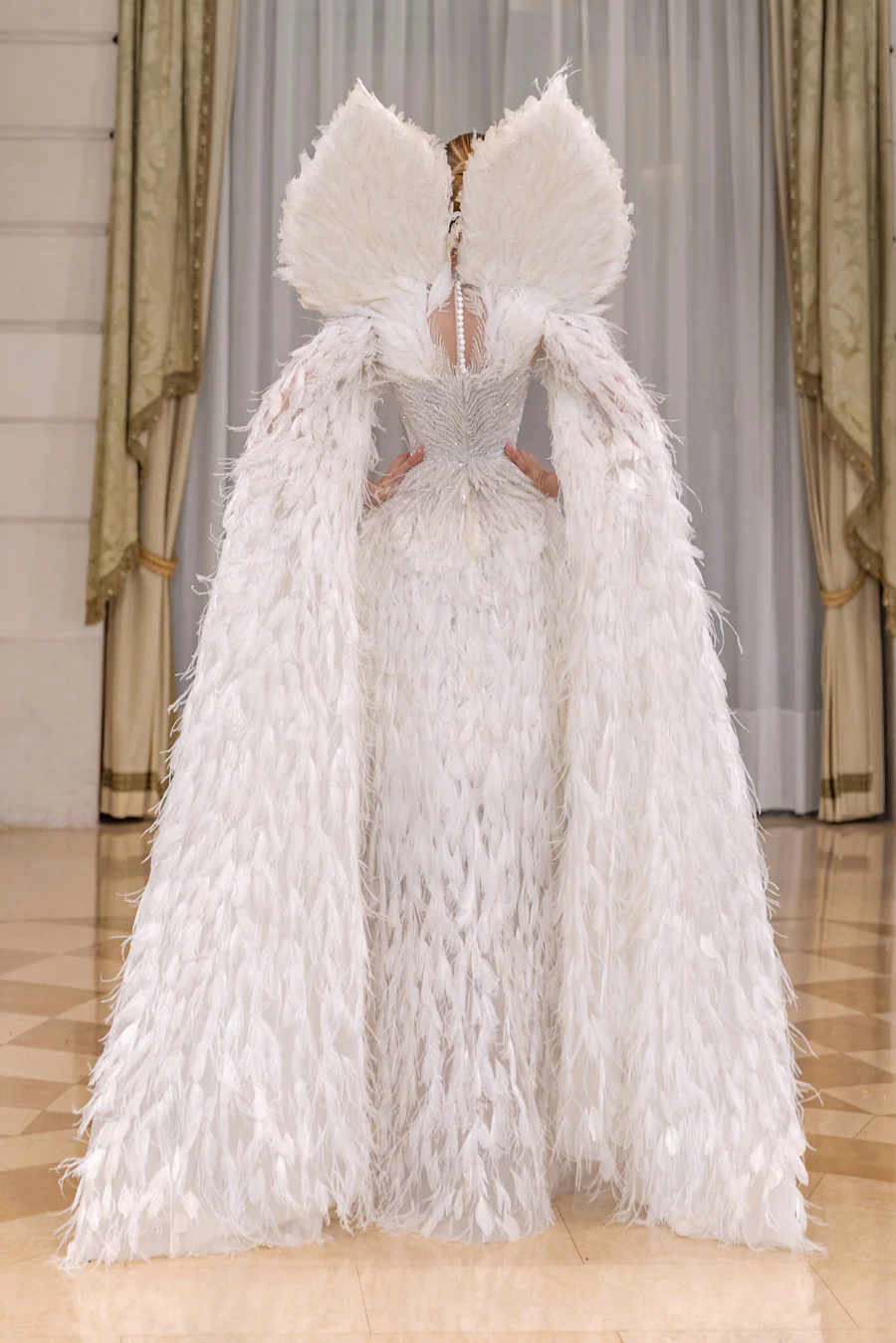 في قلب المجموعة، ظهر فستان الزفاف كخلاصة سردية رائعة، مصنوعًا بدقة فائقة من الريش المثبّت يدويًا، وقصّة نحتية هادئة تُضيف شعارًا رمزيًا عن البدايات الجديدة والحماية—في مشهد يشبه اللحظة التي يولد فيها شكل جديد من الأناقة والهوية.