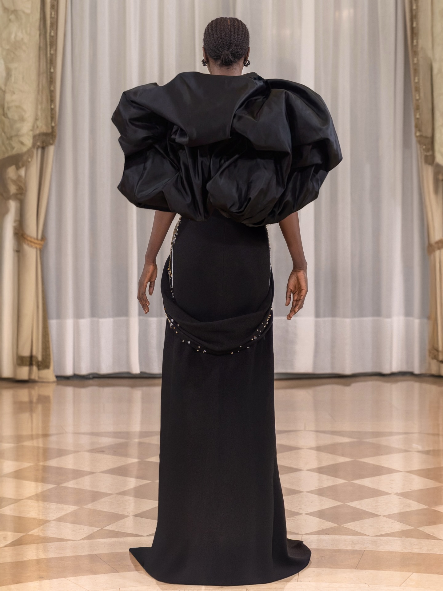 قبيسي في هذه المجموعة لا يستخدم القماش كنسيجٍ فقط، بل كـ مادةٍ نحتية تُشكَّل وتُنحت كما في أعمال الفن المعماري. القطع ظهرت وكأنها تستلهم بنى هندسية ثابتة، تعانق الجسد في توازن بين الصلابة والمرونة، وتُعيد تعريف الفستان الكلاسيكي إلى تكوينات تشبه العمارات المصغّرة.