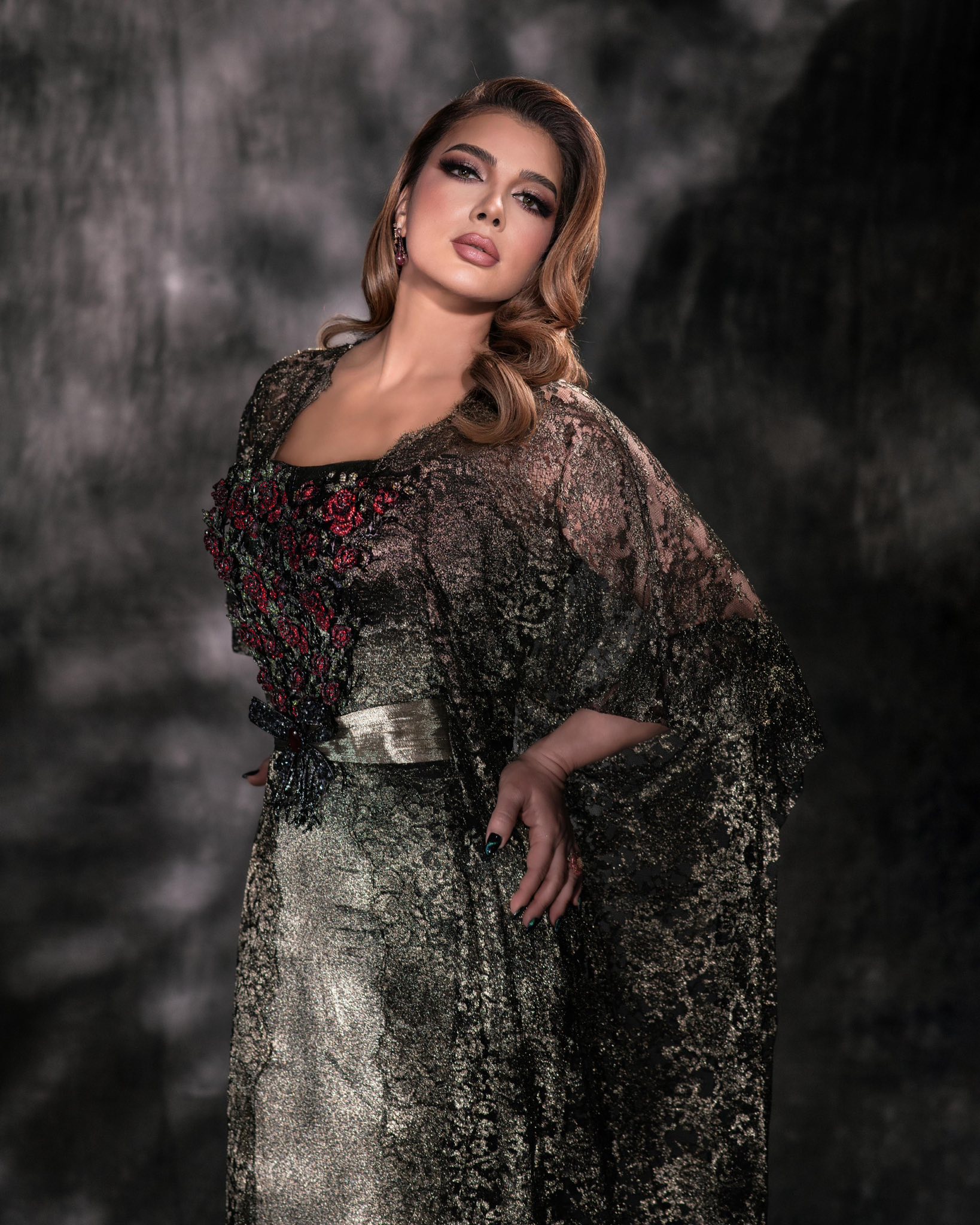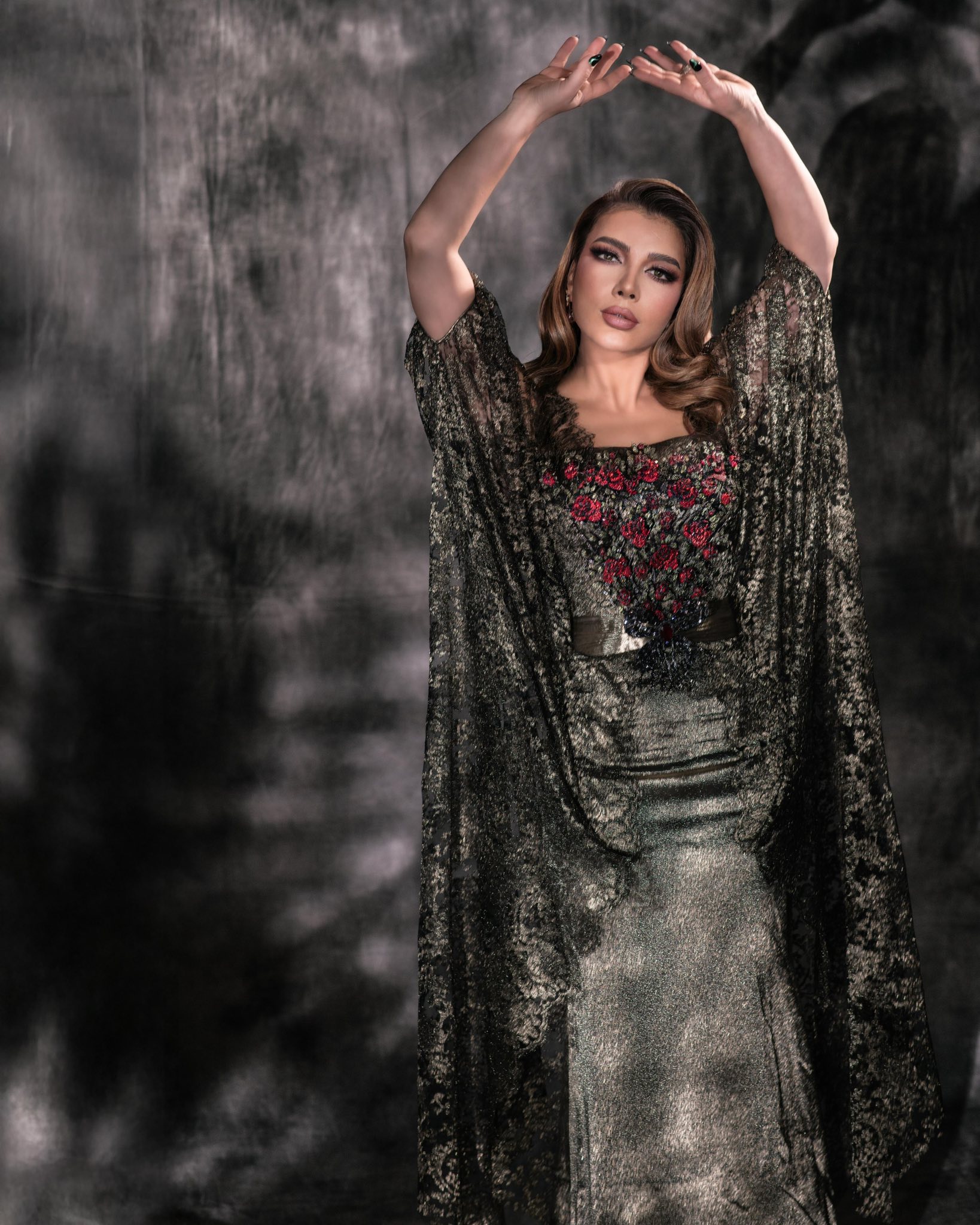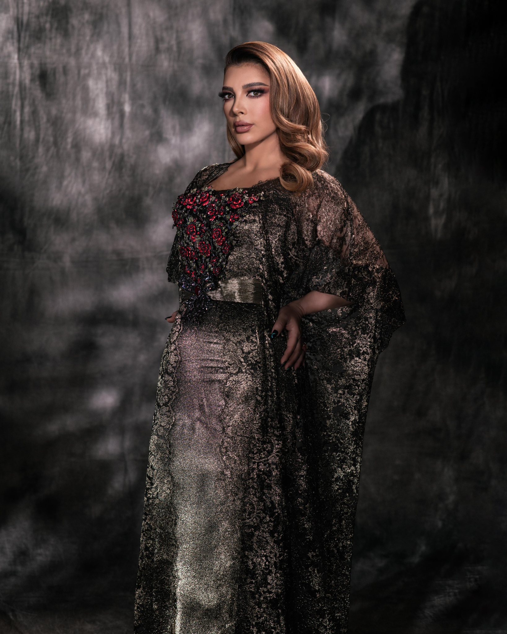 إطلالة أصالة في الحفل جاءت امتدادًا لهذا المزج بين الجذور والحداثة. ارتدت ثوبًا من تصميم هويدا البريدي يقف عند تخوم التراث والعصرية، بلونٍ متماوج بين الرمادي والأسود، كأنه قماش معتّق يحمل آثار الزمن ولمعانه الخافت في آنٍ واحد.
