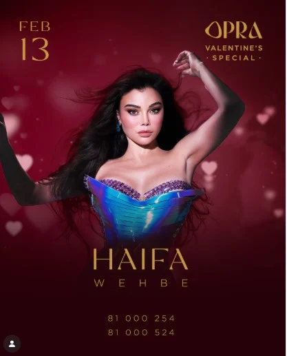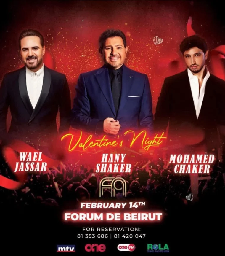 بيروت: تطل الديفا هيفاء وهبي من مسرح "أوبرا بيروت" يوم 13 فبراير (قبل طيرانها إلى قبرص)، بينما يجمع "فوروم دي بيروت" الثلاثي هاني شاكر، وائل جسار، ومحمد فضل شاكر في ليلة واحدة.