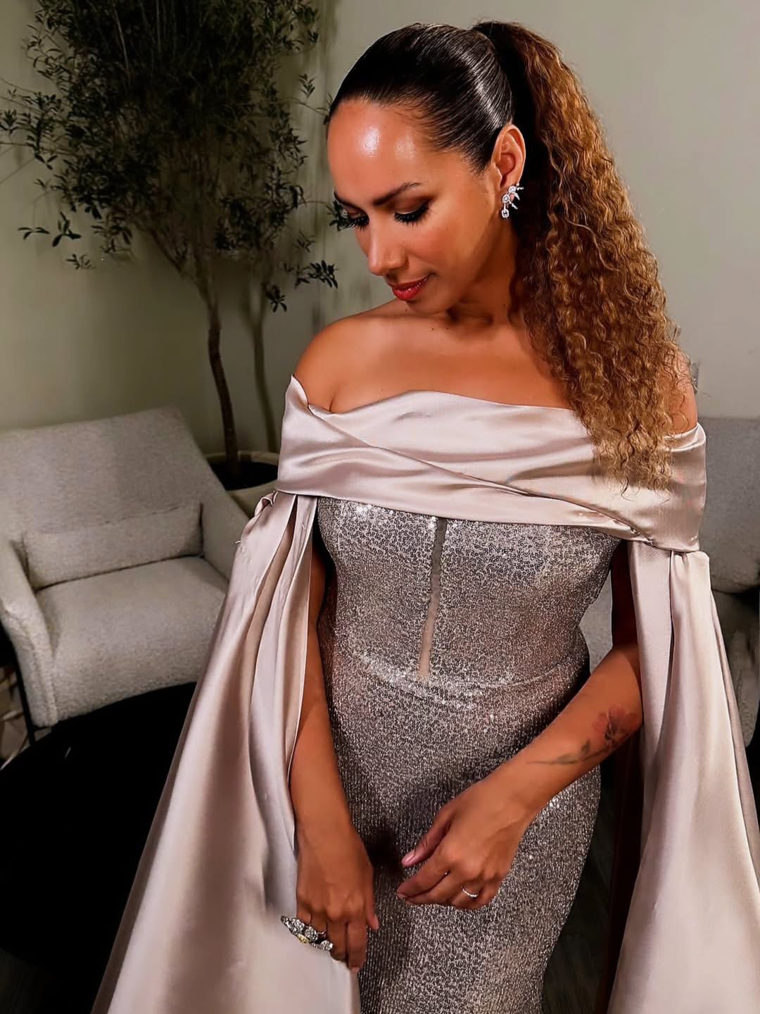 وعلى صعيد الموضة، اختارت ليونا لويس فستاناً من مجموعة “She Is Now” للمصممين خالد ومروان، وهو تصميم عكس فلسفة الدار القائمة على الأنوثة المعاصرة والقوة الهادئة. جاء الفستان بانسيابية راقية تمزج بين تدرجات الفضي والشمباني، مع تطريزات دقيقة ولمسات لامعة التقطت الضوء بحرفية، مما منح النجمة حضوراً مهيباً يوازي ضخامة الحدث.