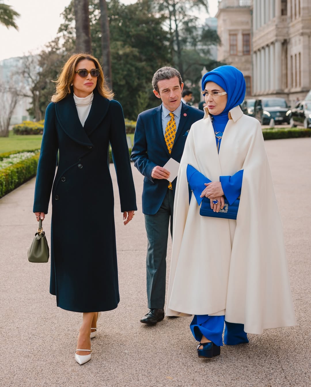 اختارت الملكة رانيا إطلالة تنتمي إلى روح المكان من دون أن تذوب فيه، فجاء اختيارها للّون الأخضر البترولي موفقًا في هدوئه وفخامته. لون يستمد حضوره من الطبيعة أكثر مما يستمده من الأضواء، يوحي بالسكينة والثبات، ويحمل في طيّاته رمزية ثقافية وتاريخية تتقاطع مع الجوهر التركي، ما جعل الإطلالة تبدو منسجمة بصريًا وفكريًا مع المكان والحدث.