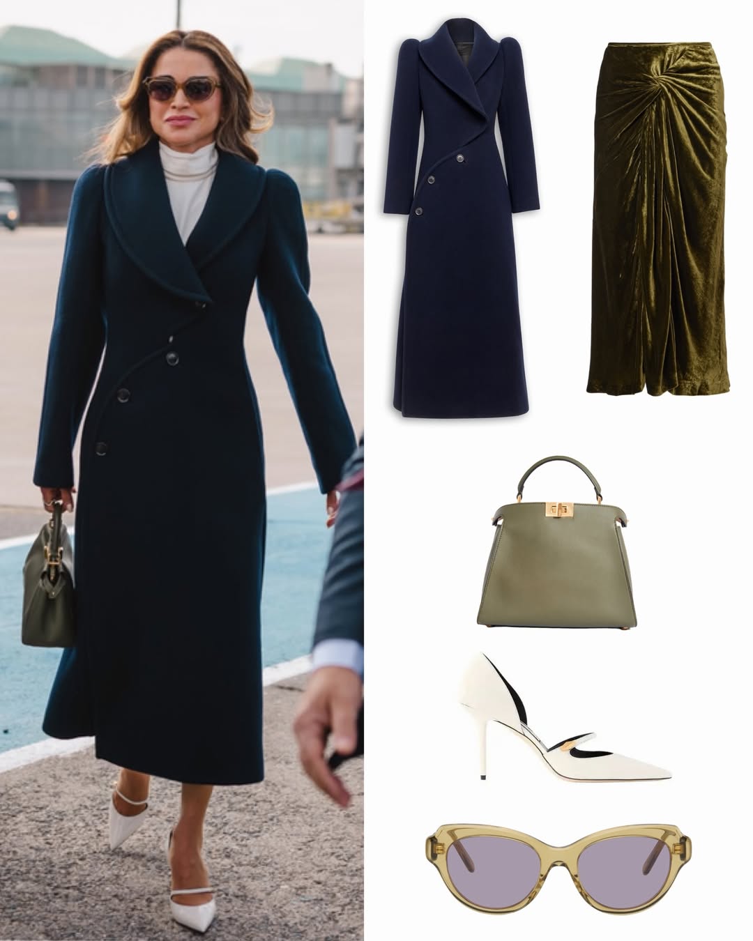 ارتدت جلالتها تنّورة متوسطة الطول من المخمل الأخضر الكاكي، بقصّة تحتضن الساقين وتفصيل زمزمة أنيق (Draped Velvet Midi Skirt)، من توقيع دار Dries Van Noten، نسّقتها مع توب أبيض بياقة عالية يعكس أسلوبًا رسميًا ناعمًا وخاليًا من التكلّف. ولإكمال الصورة، اختارت معطفًا طويلًا من الجوخ (Wool Curved Coat) من دار Alaïa، تميّز بخطوطه الواضحة وبساطته المدروسة، ليمنح الإطلالة توازنًا دقيقًا بين الرصانة والراحة.
