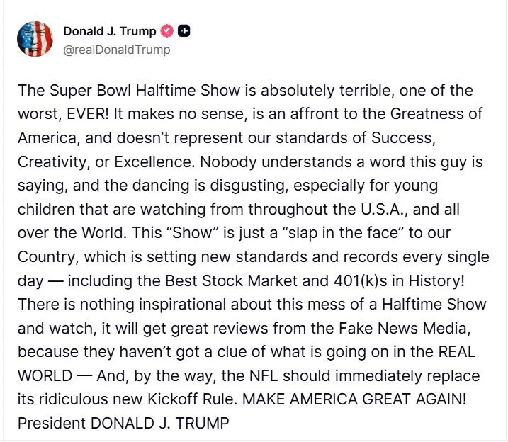 وفي سياق هجومه، ربط الرئيس الأمريكي بين ما وصفه بـ "العرض الفوضوي" وبين نجاحات إدارته الاقتصادية، معتبراً أن الفقرة الفنية كانت بمثابة صفعة في وجه الإنجازات والأرقام القياسية التي تحققها البلاد في سوق الأسهم. كما سخر ترامب من وسائل الإعلام التي توقع أن تمنح العرض تقييمات إيجابية رغم افتقاره للإبداع والتميز الأمريكي المعهود، واختتم انتقاداته بتوجيه سهام النقد مجدداً لدوري كرة القدم الأمريكية "NFL"، مطالباً بإلغاء التعديلات الجديدة على قوانين اللعبة التي عارضها مراراً.