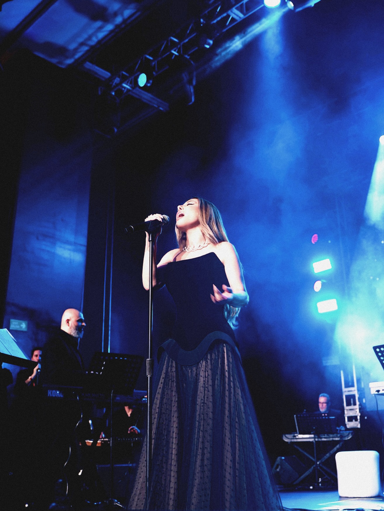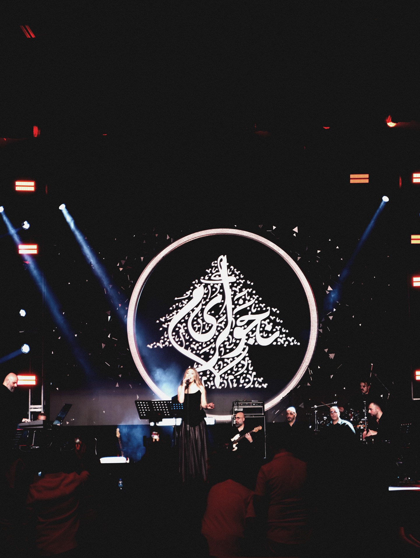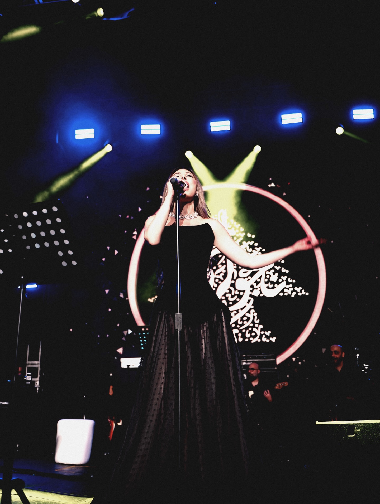 اختارت نجوى كرم إطلالة سوداء لافتة من تصميم المصمّم اللبناني نيكولا جبران، جاءت على شكل بوستيه بحمالات رفيعة، مع تنورة واسعة تداخل فيها الفوال الشفاف، وقصّة مدروسة عند الخصر أضفت حركة وانسيابية لافتة على المسرح.