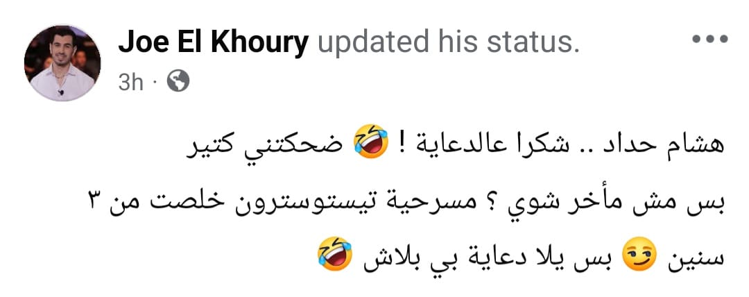 علق الممثل وصانع المحتوى اللبناني جو خوري على مقطع فيديو نشره هشام حداد ضمن برنامج "كتير هلقد"، حيث انتقد الأخير مسرحيته "تيستوسترون" التي انتهى عرضها منذ ثلاث سنوات، وكتب جو بشكل ساخر: "هشام حداد .. شكرا عالدعاية! ضحكتني كتير، بس مش مأخر شوي؟ مسرحية تيستوسترون خلصت من ٣ سنين، بس يلا دعاية بي بلاش."