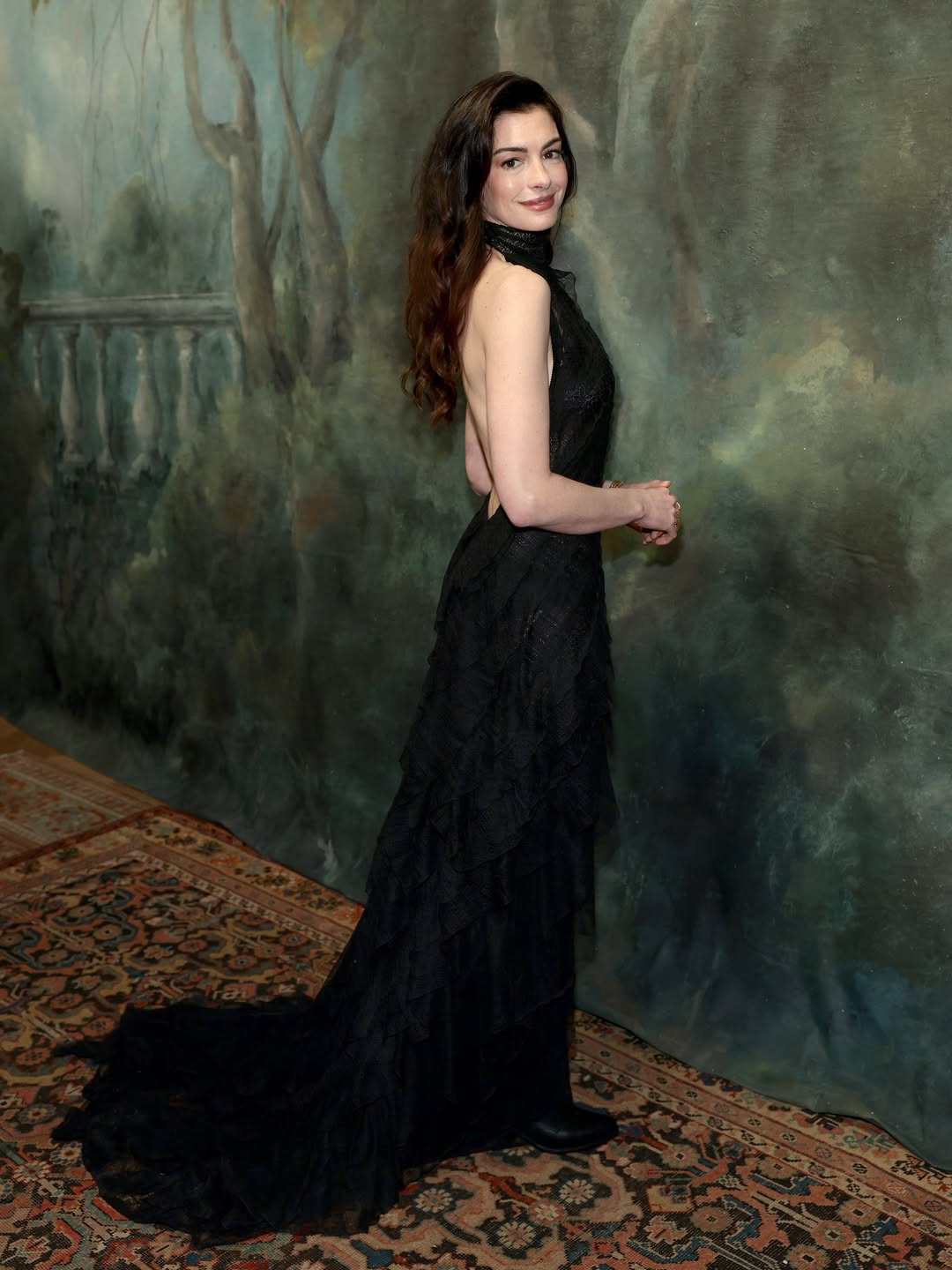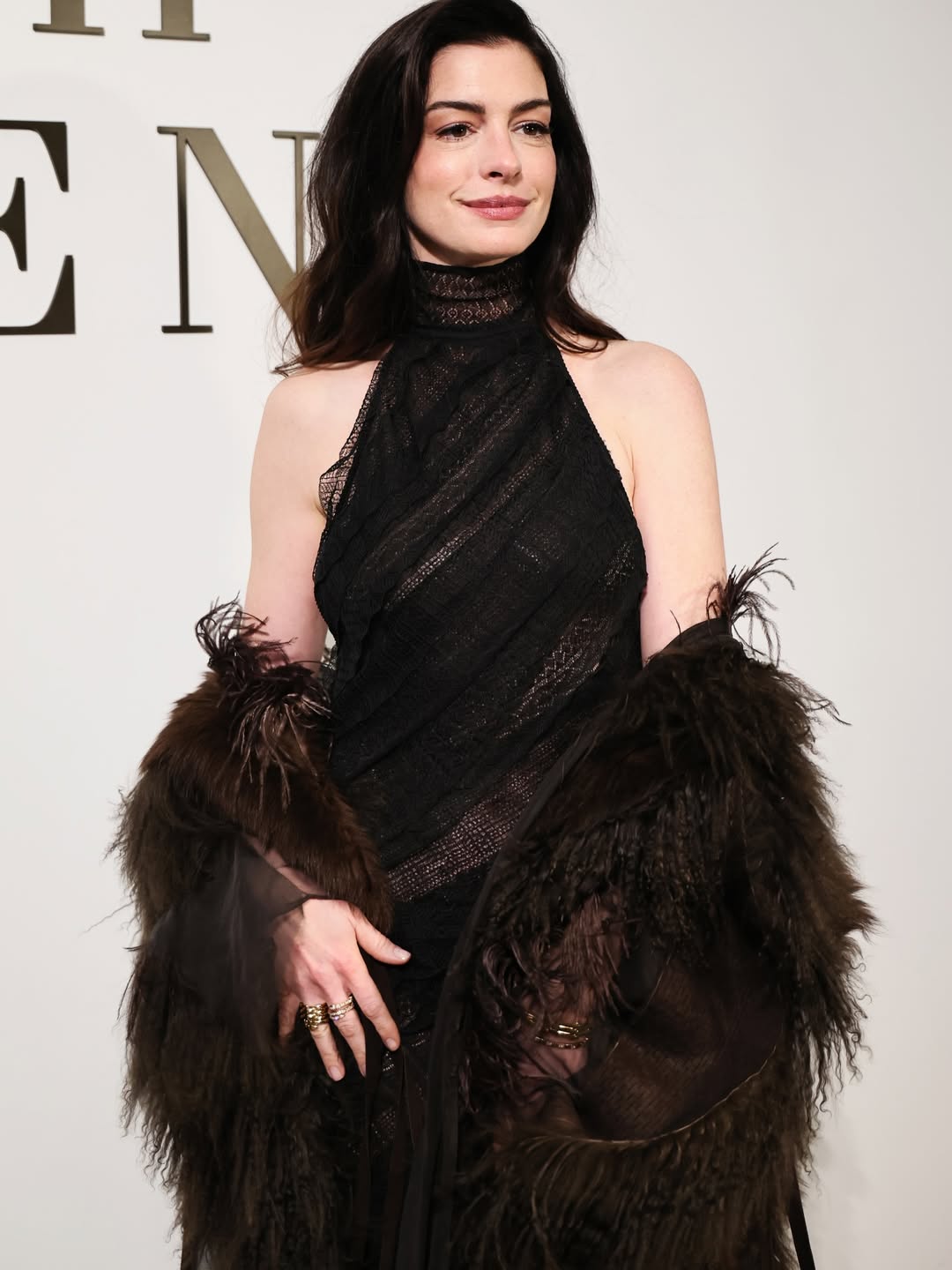 تألقت هاثاواي بفستان أسود شفاف من مجموعة Ralph Lauren Fall/Winter 2026، بتفاصيل تخريم ناعمة وكتفين مكشوفين بأسلوب "هالتر نك". جاء الفستان ياقة عالية وقصة طويلة تلتف حول الجسم بشكل أنيق، مع ظهر مكشوف وذيل طويل يضفي على الإطلالة حضورًا آسراً يبرز القوام بدقة هندسية متقنة.