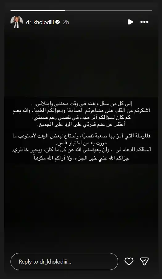 عبر حسابها الرسمي على "إنستغرام"، حددت الدكتورة خلود تاريخ 18 فبراير كـ "يوم حاسم"، ونشرت دعاءً مؤثراً طلبت فيه المعونة والنصرة، قائلة: "اللهم إني مغلوب فانتصر.. ادعوا لنا". ولم تكتفِ الدكتورة خلود بالجانب الديني، بل وجهت خطاباً عاطفياً مباشراً لمتابعيها وصفتهم فيه بـ "الأهل"، مذكرة إياهم بمسيرة 11 عاماً من التواصل اليومي، في محاولة لاستقطاب الدعم المعنوي قبل الجلسة المرتقبة.