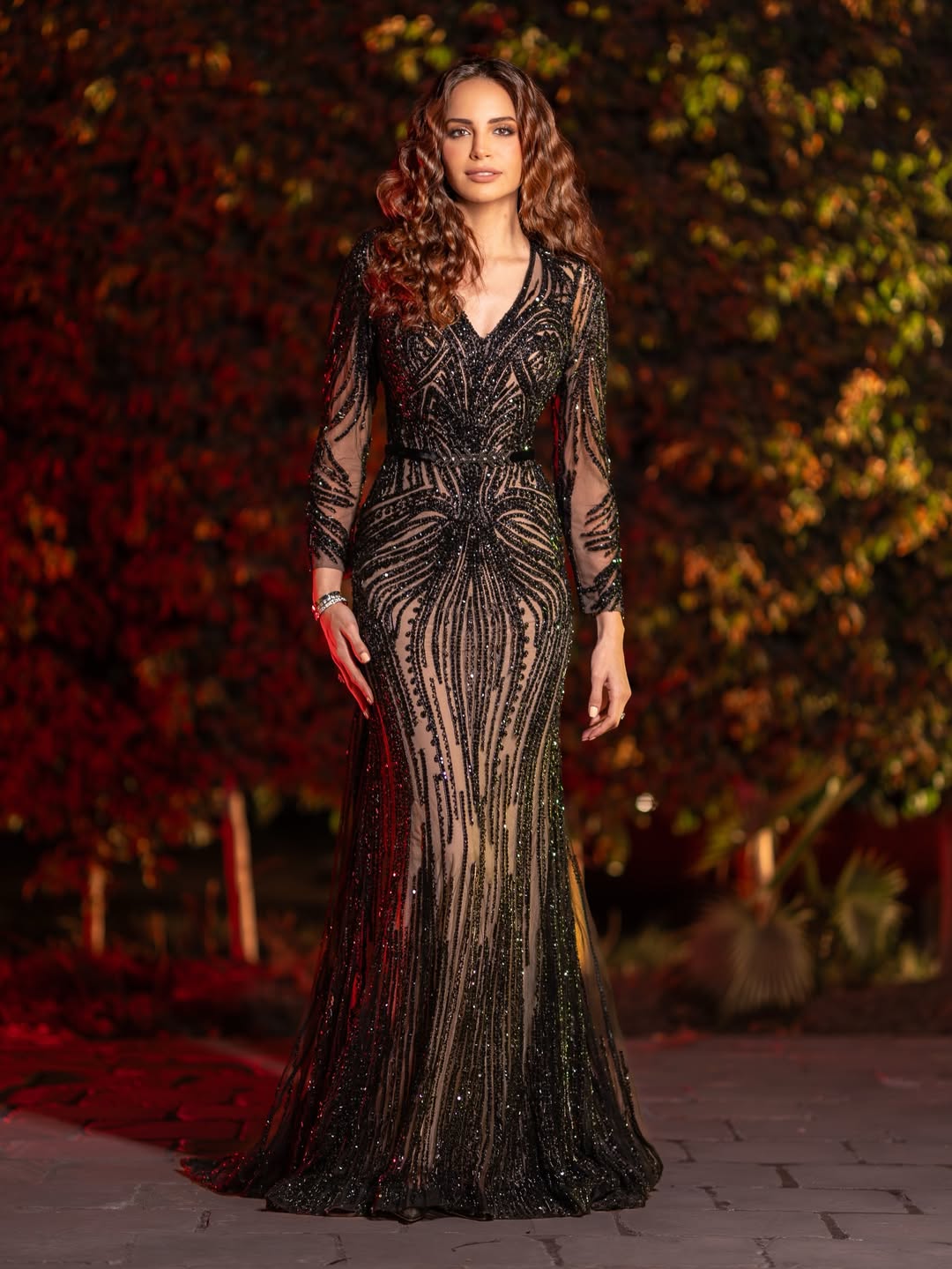 ارتدت أمال ثوبًا أسودًا، مشغولًا على الجسد بطريقة مذهلة، ليس مجرد قماش يُلفّ، بل رسم خيوط مسبوكة ومشغولة يدويًا على يد حرفيين خبراء. كل خيط، كل نقشة، وكل تقاطع للأقمشة تم تنقيحه وغزله بعناية لتتحول الخامة إلى قطعة فنية تصغي، وتتفاعل مع حركات الفنانة.