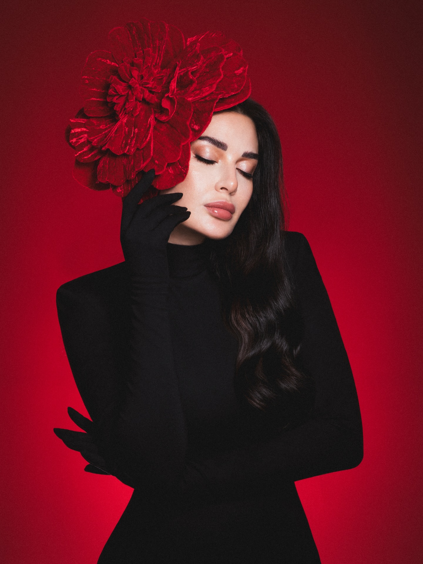 وحدها كارول سماحة اختارت أن تذهب أبعد من الفستان… نحو الفكرة. في صور فنية غارقة بالأحمر، بدت كأنها ترتدي حديقة كاملة من الورد، أو كأنها تولد من بين تلالٍ قرمزية لا يظهر منها سوى الرأس واليدين المرفوعتين بقفازات حمراء.