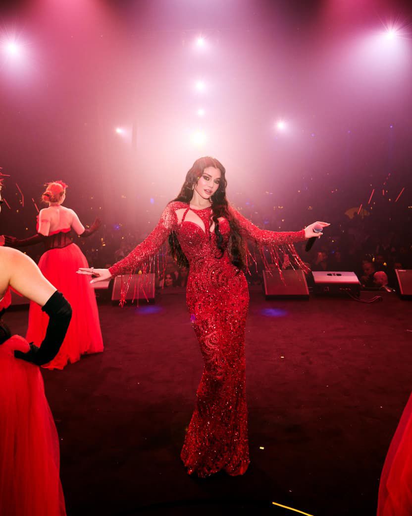 اعتمد شربل زوي لونا أحمر غنيا ومشبّعا، يرمز إلى الحب والشغف، لكنه قدّمه بقالب بصري متكامل، بحيث بدا الفستان امتدادا طبيعيا لهوية المناسبة. وقد ساهمت الخامات المضيئة والقصّة الضيقة في إبراز الحضور الآسر لهيفاء، لتتحوّل الإطلالة إلى مشهد بصري متكامل يعكس فهم المصمّم لطبيعة شخصيتها على المسرح.
