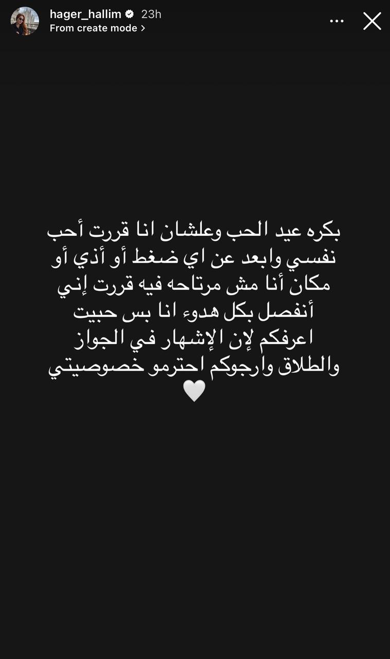 وقالت هاجر عبر حسابها الرسمي على إنستجرام: "عيد الحب وعلشان أنا قررت أحب نفسي وأبعد عن أي ضغط أو أذى أو مكان أنا مش مرتاحة فيه، قررت إني أنفصل بكل هدوء. أنا بس حبيت أعرفكم لأن الإشهار في الجواز والطلاق وأرجوكم احترموا خصوصيتي."
