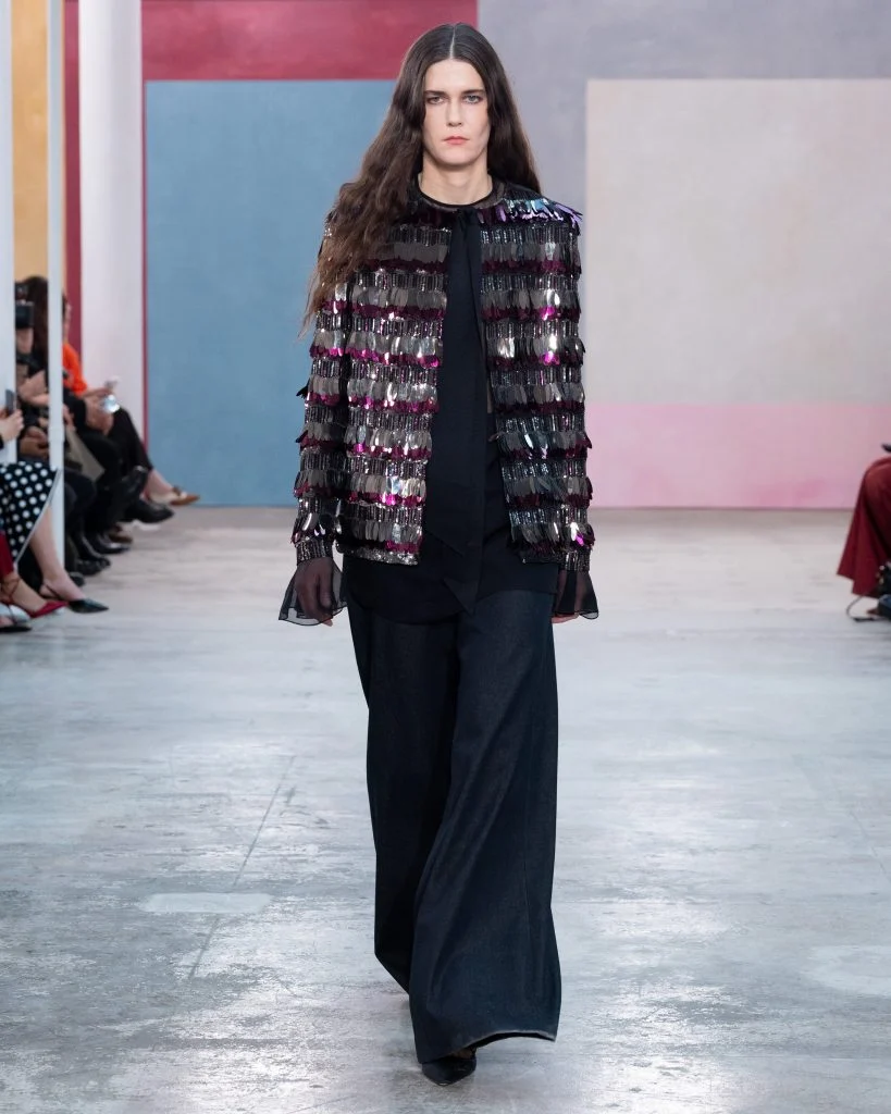 مع حلول المساء، دخلت الإضاءة الذهبية إلى المشهد عبر كنزات الباييت اللامعة ومعاطف وفساتين ذهبية متوهجة. صُنعت هذه القطع من مستطيلات صغيرة من الترتر، لتخلق سطحاً مضيئاً يستحضر النغمات الذهبية الهادئة في لوحة Friendship (1963) للفنانة Agnes Martin، حيث يتحول الضوء إلى إحساس شاعري هادئ.