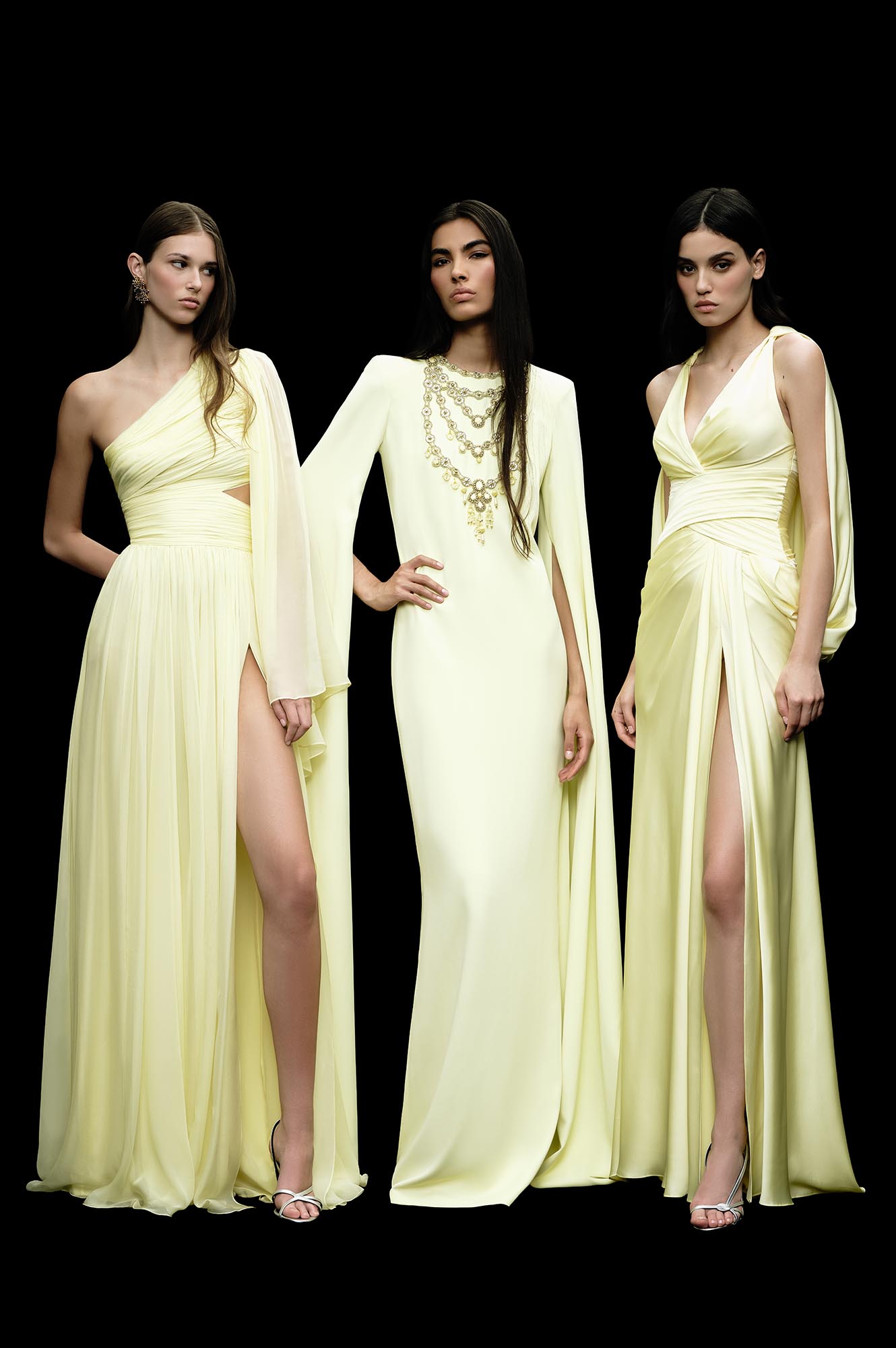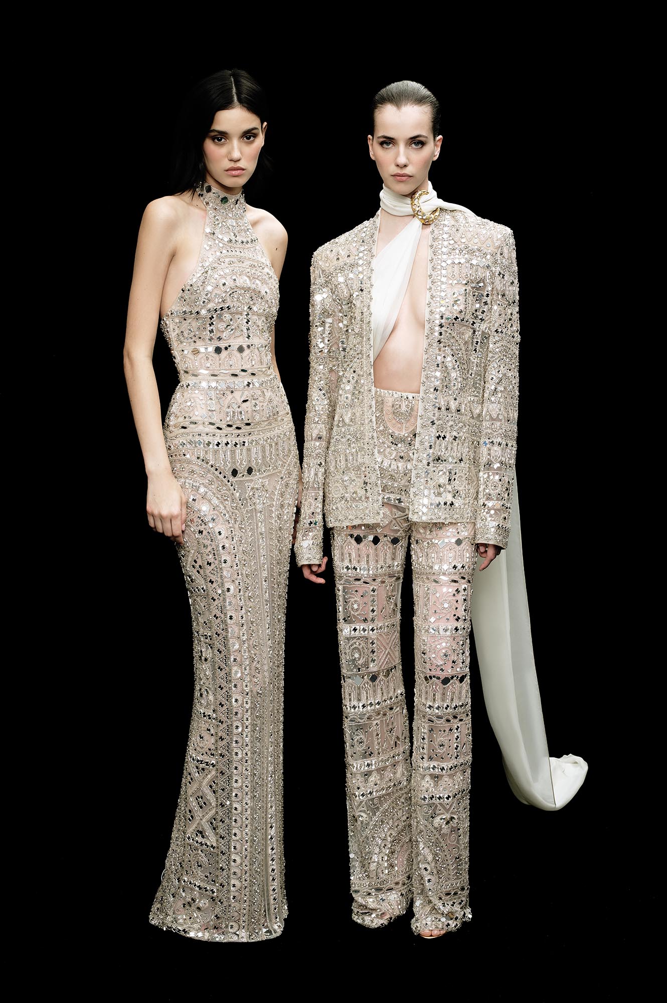 التطعيمات المذهبة، الأسطح المعدنية المضيئة، والزخارف المتلألئة تمنح كل قطعة وهجاً آسراً، بينما تخلق القصّات البسيطة توازناً متناغماً مع غنى التراث الشرقي. تتجسد التصاميم في silhouettes نحتية وخفيفة في آن، تعبّر عن أنوثة متعددة الأوجه: حسية وملكية، مضيئة وغامضة.