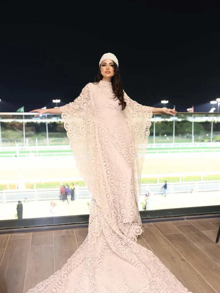 تألقت روان الخالد بزي يشبه العباية الواسعة من القماش المحبوك والمخرم باللون الباستيلي الوردي، مستوحى من التراث السعودي. صُمم الفستان مع ذيل طويل مستلهم من الطاقية الرجالية “المشخل”، ليجمع بين التراث والابتكار العصري، مع لمسة استعراضية مميزة. تزينت الإطلالة بمجوهرات دقيقة أضافت فخامة وتألقاً، لتصبح تحفة فنية تمثل تناغم الحرف اليدوية والتقاليد الأصيلة.