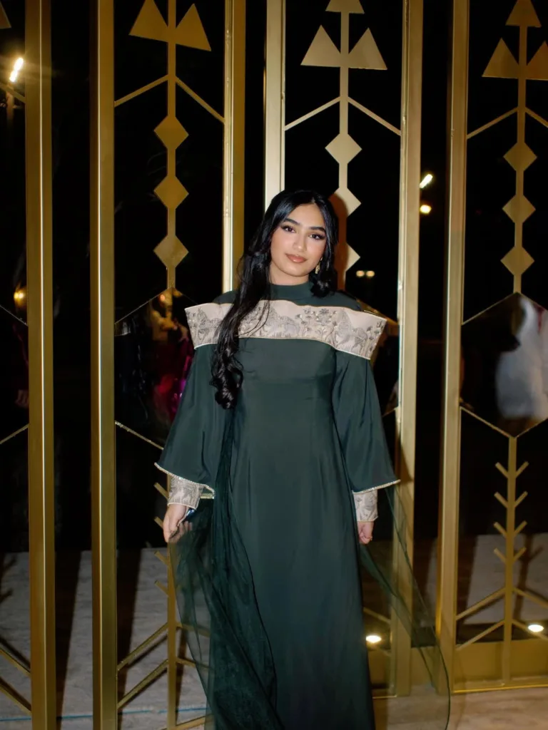 اختارت مريم الناصر فستاناً أسود مطرزاً بتفاصيل زرقاء وأكمام شيفون ناعمة من أصايل لاين، حيث بدت التطريزات وكأنها لوحة فنية تتحرك على الفستان. جاءت الإطلالة متوازنة بين الفخامة والرقة، مع إبراز الخطوط التراثية بشكل عصري يخطف الأنظار.