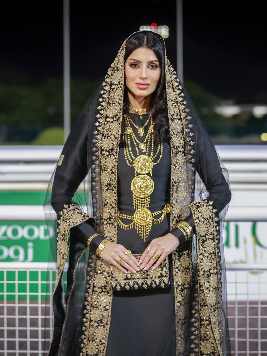 ظهرت رغد سليمان بفستان أسود ضيق مزين بتطريز ذهبي غني على الأطراف، مع وشاح أسود شفاف مطرز بالذهب انساب من الرأس، ليكمل الفستان بأناقة وفخامة. أرفقت الإطلالة حقيبة صغيرة بنفس تفاصيل التطريز، مع مجوهرات ذهبية متراكمة أبرزت الطابع الملكي، لتصبح إطلالة تجمع بين الرقي العصري والفخامة التراثية.
