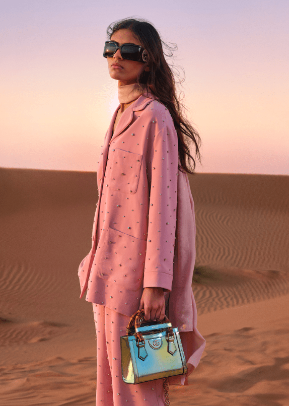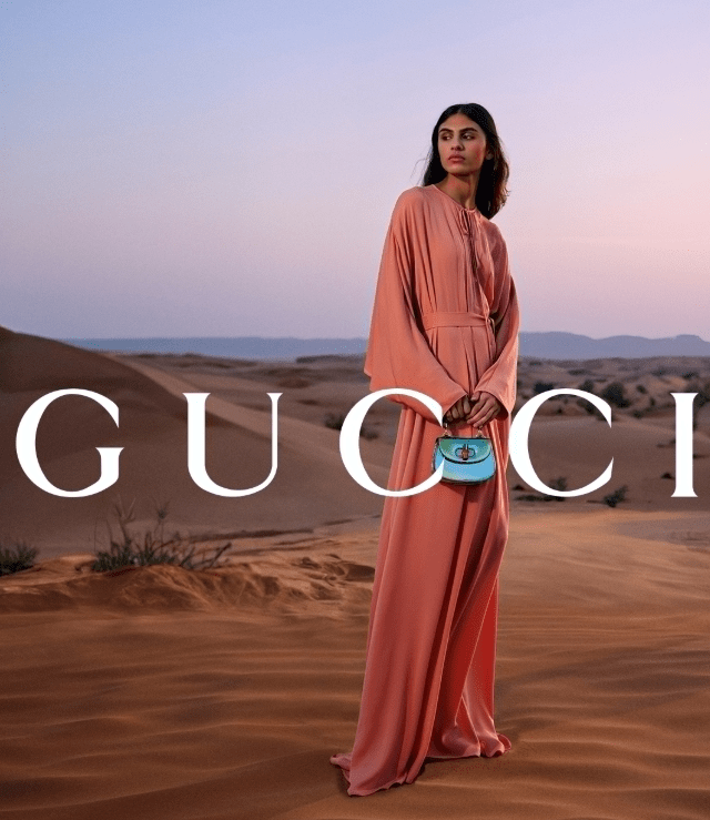 برزت المجموعة كاحتفاء بصري بسحر الليالي الشرقية، حيث أعاد المدير الإبداعي ساباتو دي سارنو ابتكار الأيقونات الكلاسيكية مثل حقيبتي Jackie Notte و Bamboo 1947 بألوان ميتاليكية تعكس ضوء القمر على الرمال.