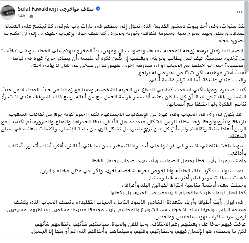 أثارت الفنانة السورية سلاف فواخرجي تفاعلاً واسعًا بعد منشور مطوّل عبر حسابها على فيسبوك، تناولت فيه مفهوم الحرية الشخصية واحترام الثقافات المختلفة، على خلفية الانتقادات التي طالتها بسبب ظهورها بالحجاب خلال مشاركتها في تجربة فنية داخل إيران.