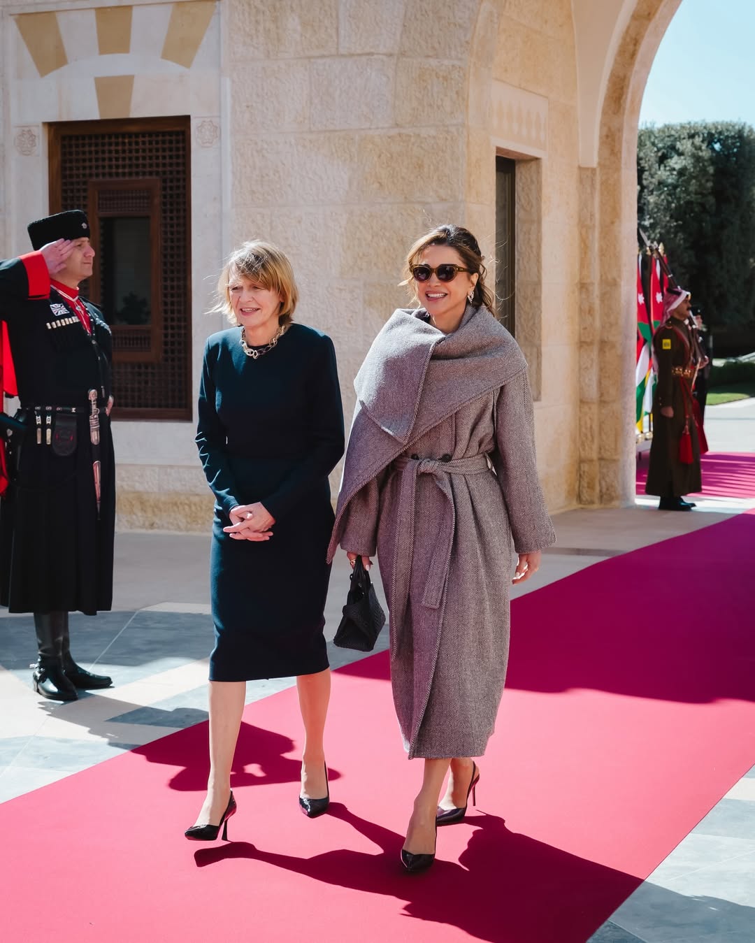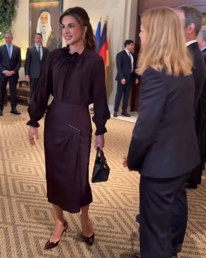 للمناسبة الرسمية، اختارت الملكة رانيا معطفاً واسعاً بقصة غير متناظرة باللونين الإسبريسو والرملي من Ferragamo، تصميم حديث أضفى على الإطلالة طابعاً بنيوياً أنيقاً، يليق بمراسم الاستقبال الرسمية. ونسّقت المعطف مع بلوزة حريرية ناعمة من Victoria Beckham، لتبرز بساطة راقية قائمة على الخطوط النظيفة واللمسة المعاصرة.