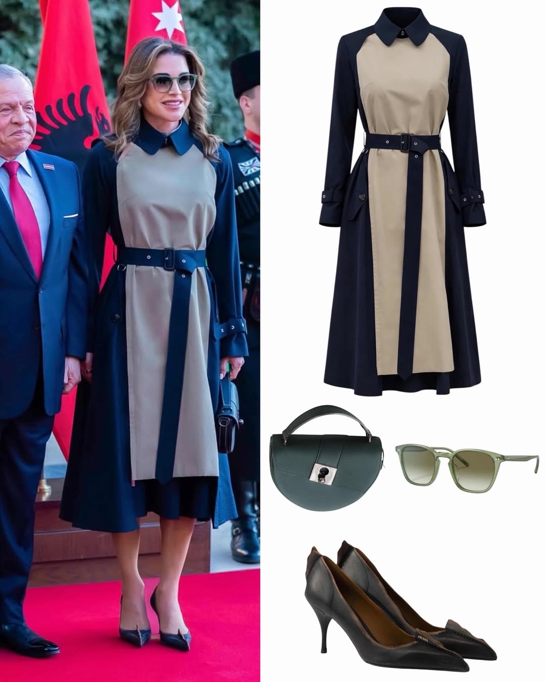 في هذه المناسبة الرسمية، اختارت الملكة رانيا إطلالة تجمع بين الرصانة والحداثة، مرتدية ثوبًا بتدرجات الكحلي والرمادي من تصميم Sacai، جاء بقصّة معطف طويل غير متماثل مع حزام يحدد الخصر، ما أضفى انسيابية راقية وحضورًا رسميًا هادئًا ينسجم مع طبيعة المناسبة الدبلوماسية.