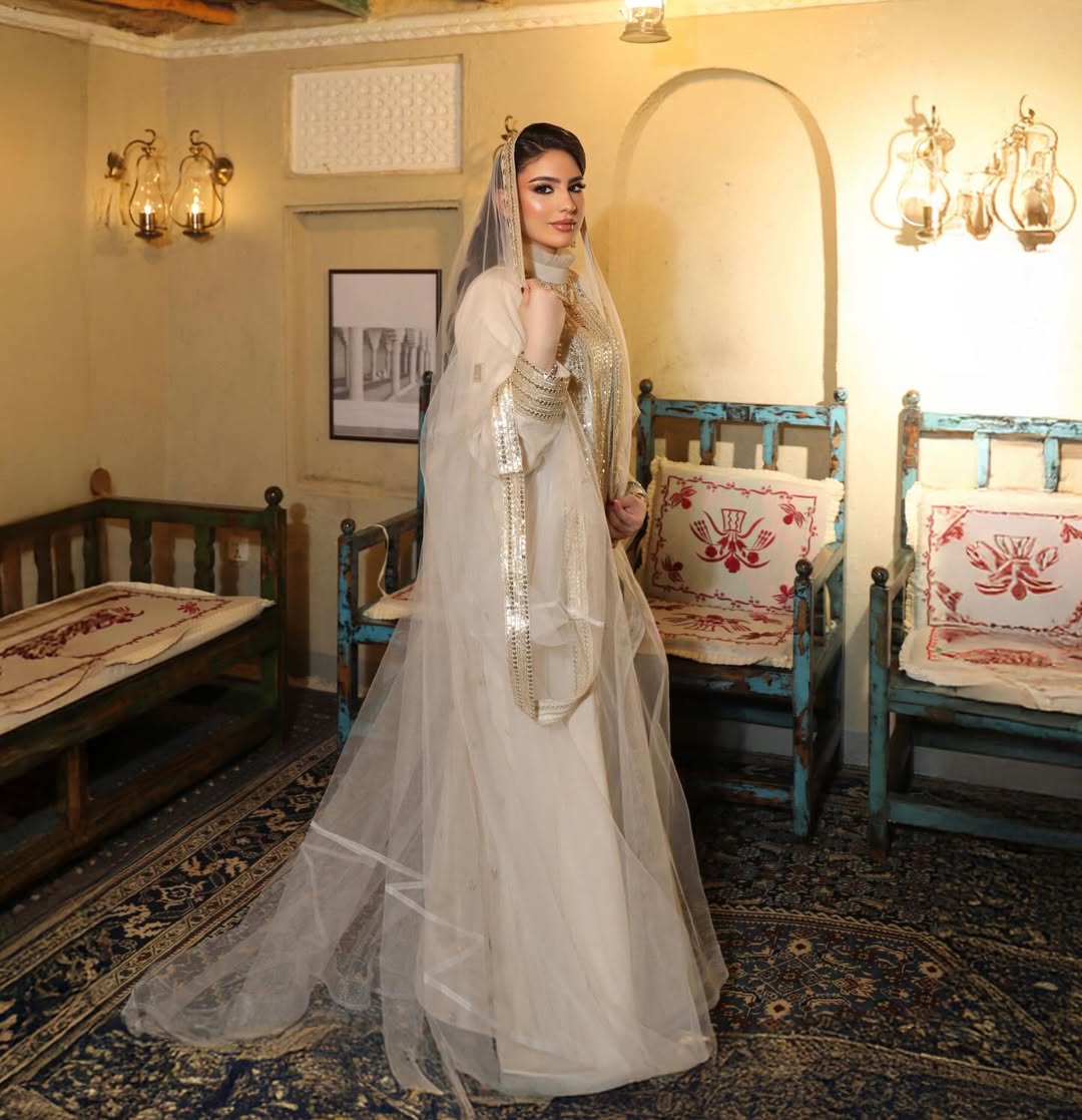 جاء فستان اللينن الأبيض المطرز بقصّة مستقيمة وأكمام واسعة حرة، مطرزة ومبطنة بالساتان، ليمنح إحساساً بالراحة والانسياب مع الحفاظ على فخامة التفاصيل. وتنساب معه طرحة تول طويلة تضيف بعداً شاعرياً للإطلالة.