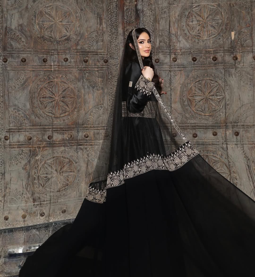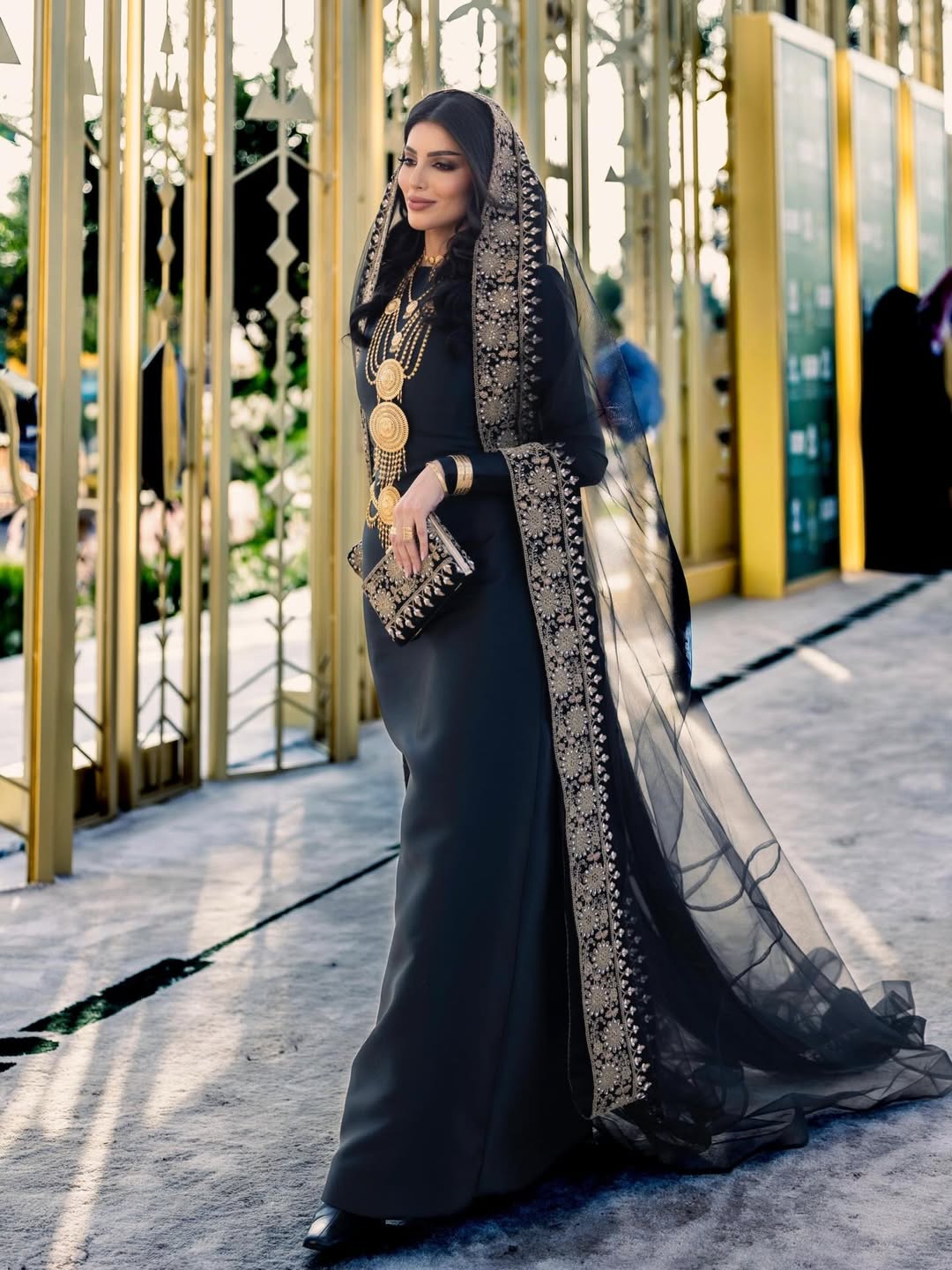 الفستان الأسود من قماش الميكادو اللامع أعاد تقديم الفخامة بأسلوب هادئ، مع الطرحة المزدوجة التطريز المائل والحزام المطرز، في تصميم يوازن بين الرقي الكلاسيكي والهوية التراثية.