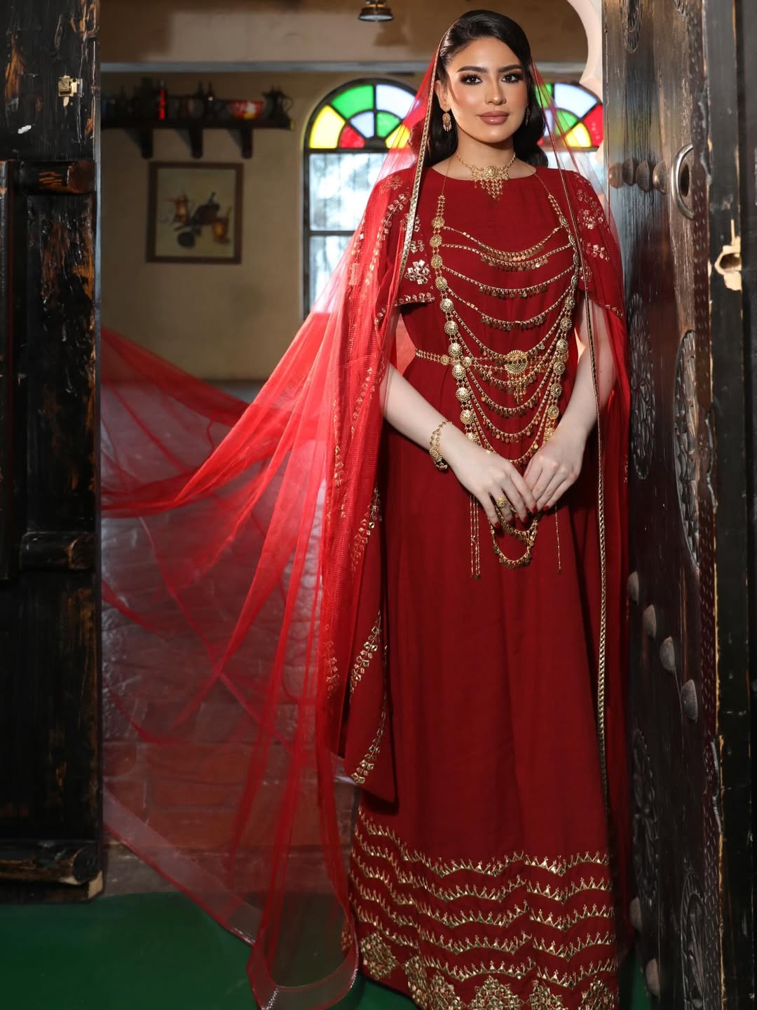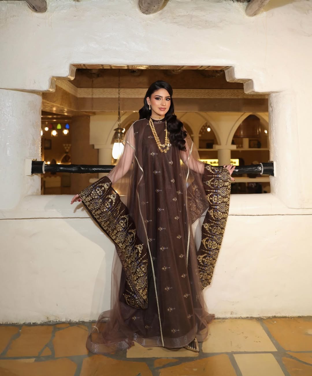 برز فستان الميكادو باللون البني بلمعة خفيفة كتعبير عن فخامة هادئة، مزين بتطريز مميز وحزام مطرز يحدد القوام بأناقة. وتكتمل الإطلالة بطرحة تجمع بين خامتين، مطرزة بأسلوب مائل مع فتحة عملية لليد، لتوازن بين الجمال والوظيفة. كما جاءت قطعة التول المطرزة مستوحاة من النشل النجدي التقليدي، لتمنح التصميم بعداً تراثياً أصيلاً.