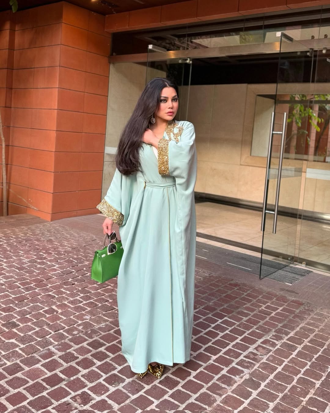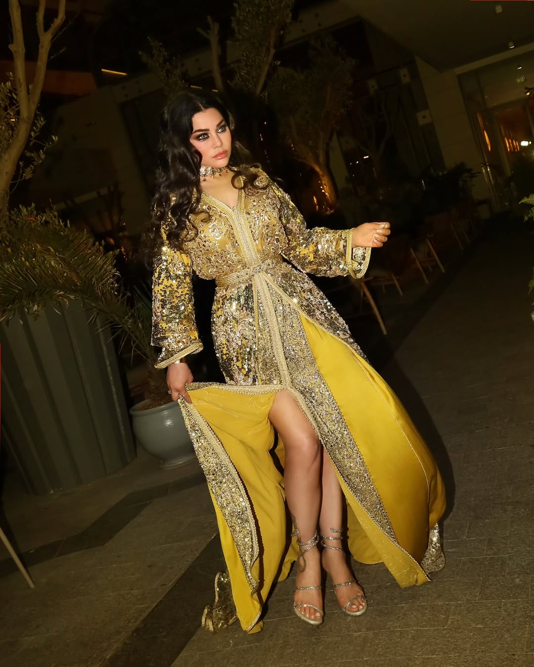 بخطى واثقة نحو الجذور، أطلت هيفاء بالقفطان المغربي الذهبي، وكأنها تستحضر أمجاد القصور الأندلسية. التطريزات التي غطت التصميم بالكامل كانت تعكس الضوء مع كل حركة، بينما جاء حزام الخصر ليؤكد على فلسفة هيفاء في إبراز الجمال العربي الأصيل. هذه الإطلالة لم تكن مجرد زي، بل كانت تحية إجلال للهوية التراثية التي تزداد بريقاً تحت مجهر أناقتها.