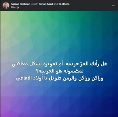 وقال رشدان في منشوره: "هل رأيك الحر جريمة، أم تحويره بشكل معاكس لمضمونه هو الجريمة؟ وراكن وراكن والزمن طويل يا أولاد الأفاعي"، في إشارة واضحة إلى تمسكه بموقفه ورفضه لما اعتبره تحريفاً لكلامه.