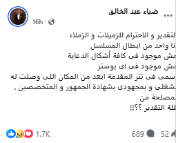 عبر ضياء عبد الخالق عن غضبه الشديد عبر حسابه الرسمي على منصة "فيسبوك"، واصفاً ما حدث بأنه "إهانة مهنية" لا تليق بمشواره الفني. وتساءل عبد الخالق في منشوره عن الأسباب الكامنة وراء هذا التجاهل، قائلاً: "أنا واحد من أبطال المسلسل، ومع ذلك لم أُذكر في أي شكل من أشكال الدعاية أو البوسترات الرسمية. هل هذا قلة تقدير أم تجاهل مقصود؟". وأكد الفنان أن مثل هذه الممارسات تشعر الممثل بعدم الاحترام، خاصة بعد سنوات طويلة من العطاء والتفاني في تقديم أدوار مميزة.
