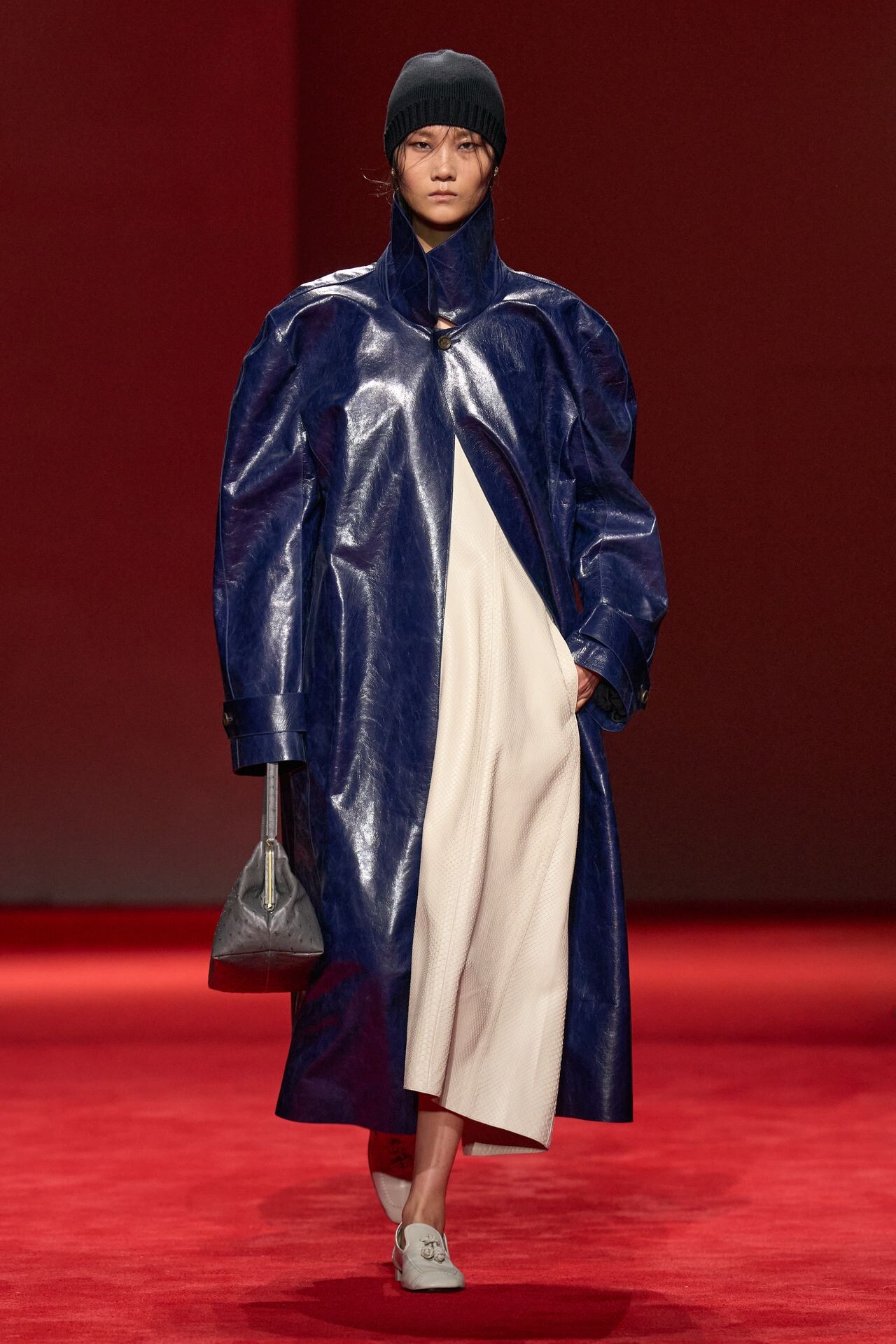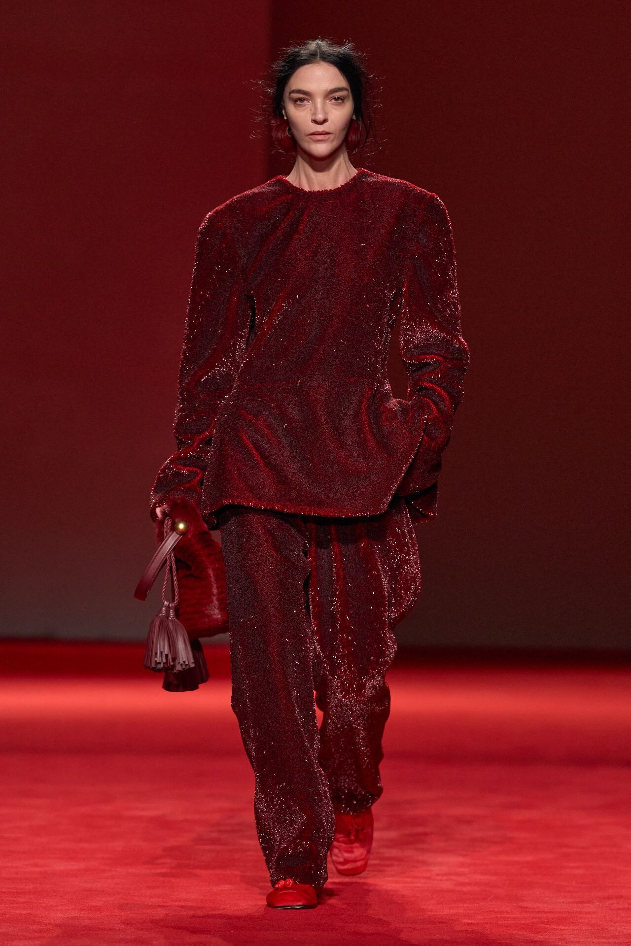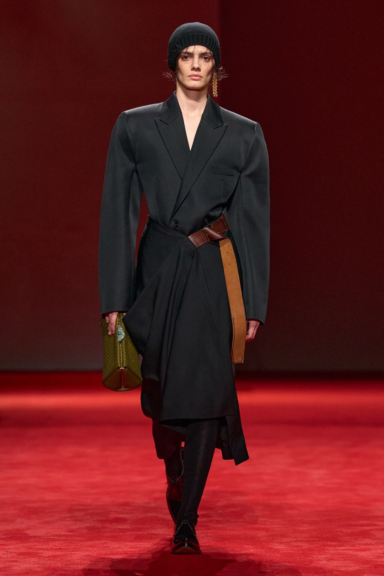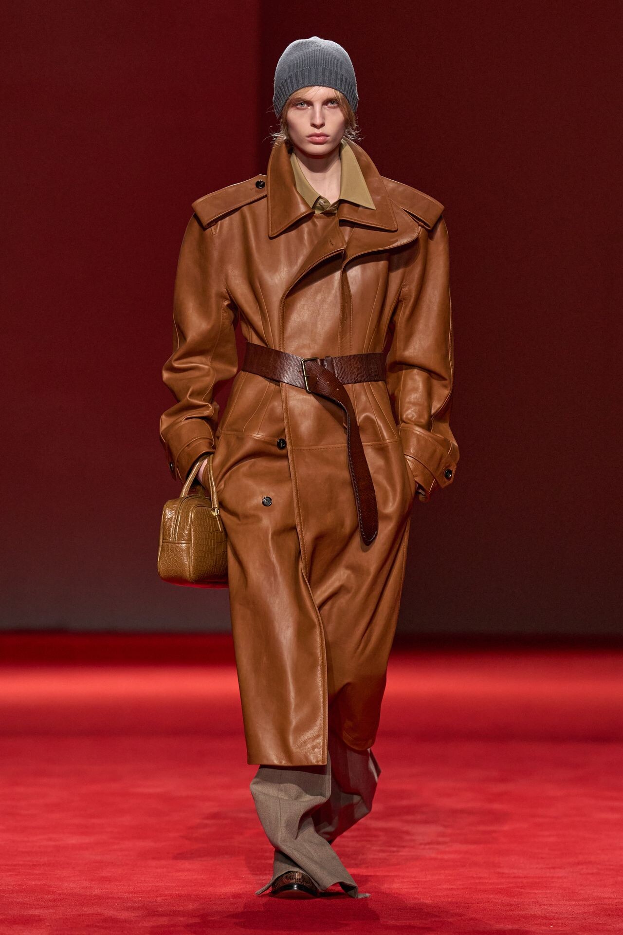 منذ الإطلالة الأولى، بدا واضحاً أن المجموعة تتحدث بلغة الصمت. سترات مفصّلة بعناية، أكتاف منحنية تمنح الجسد احتواءً بدلاً من الحدة، وبناطيل واسعة تتحرّك بثقة. الأحزمة الجلدية العريضة لم تكن زينة، بل جزءاً من البناء، تذكّر بأن هذه الدار تعرف الجلد كما يعرف الحرفي يده.