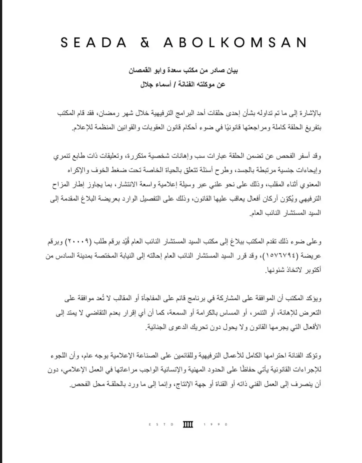 المحامية نهاد أبو القمصان أعلنت أن مكتبها تقدم ببلاغ رسمي إلى مكتب النائب العام، عقب تفريغ الحلقة محل الجدل بالكامل ومراجعتها قانونيًا وفق أحكام قانون العقوبات والقوانين المنظمة للعمل الإعلامي.