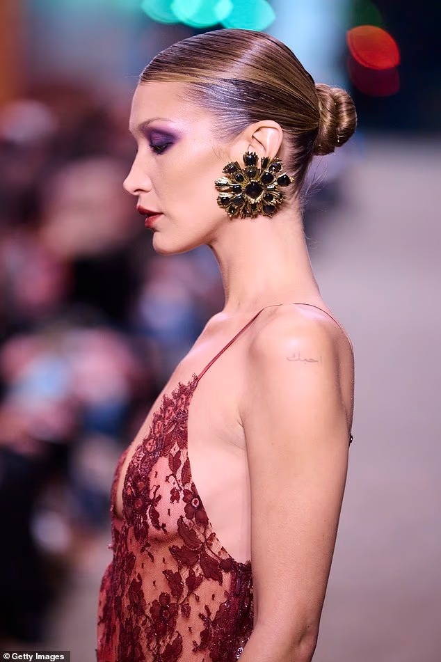 خطفت بيلا الأنظار بإطلالة وصفت بالـ "مذهلة"، حيث ارتدت "بودي سوت" (Bodysuit) من الدانتيل الأحمر الجريء بفتحة صدر منخفضة، نسقته ببراعة مع تنورة سوداء شفافة ضيقة تبرز قوامها الممشوق. ولم تخلُ الإطلالة من تفاصيل الدار الكلاسيكية، حيث أضافت جوارب بنية وحذاءً ذا كعب مدبب، مع أقراط ذهبية ضخمة منحتها هيبة تليق بـ "شحرورة" منصات العرض الحديثة. أما من الناحية الجمالية، فقد اعتمدت مكياجاً دراماتيكياً بظلال عيون أرجوانية، وشعراً ملموماً بأسلوب الـ "كعكة" المصقولة مع غرة جانبية، مما أضفى عليها مسحة من الغموض الساحر.