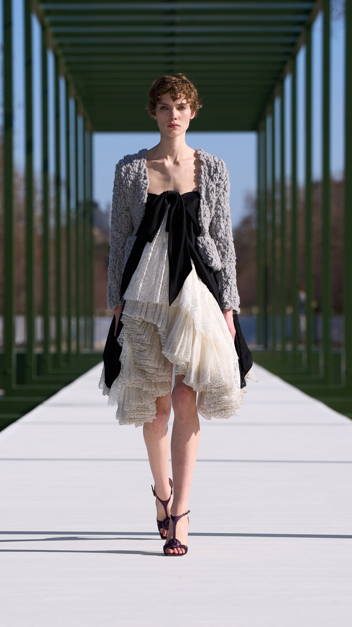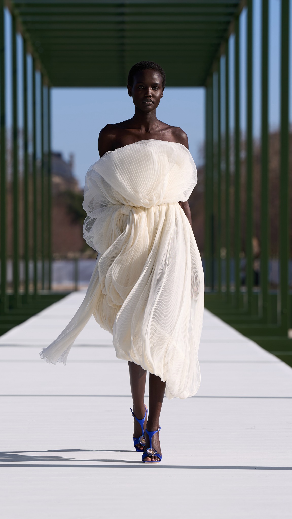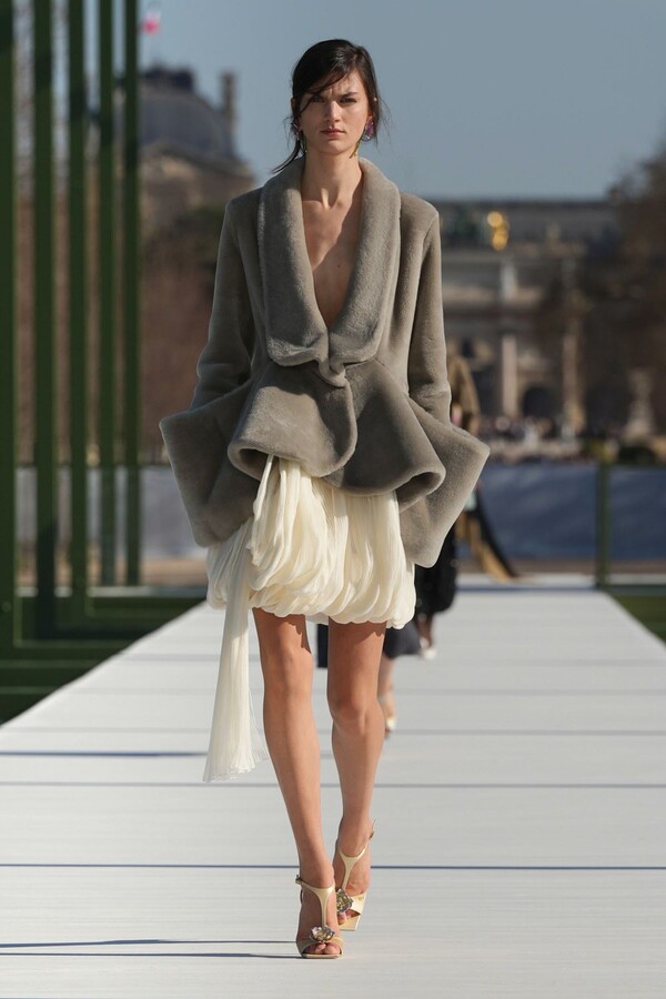 فساتين الأقفاص الحلزونية التي ظهرت في تجاربه الأخيرة في الكوتور عادت هنا بصيغة أكثر نعومة، كأنها غيوم من القماش المطوي.