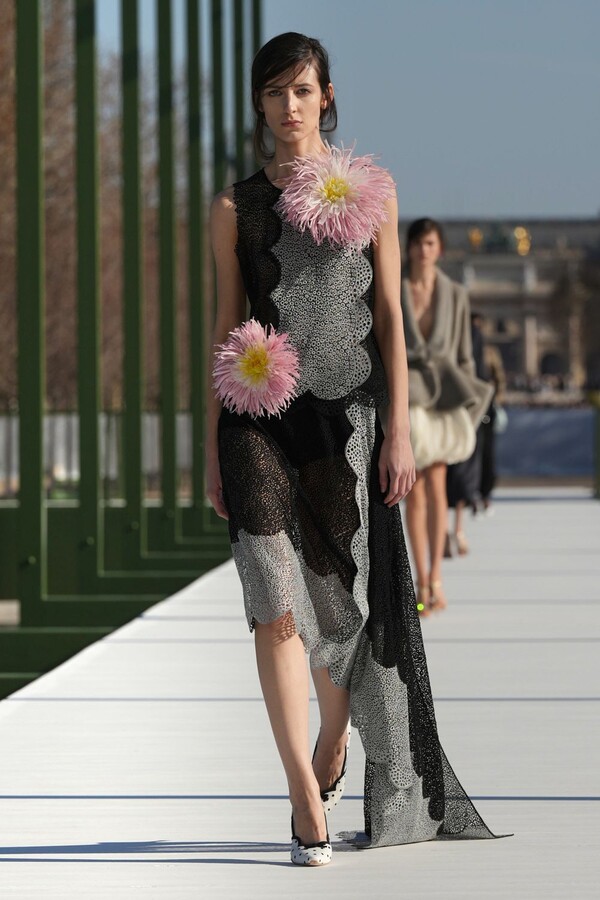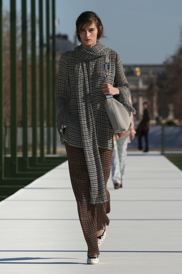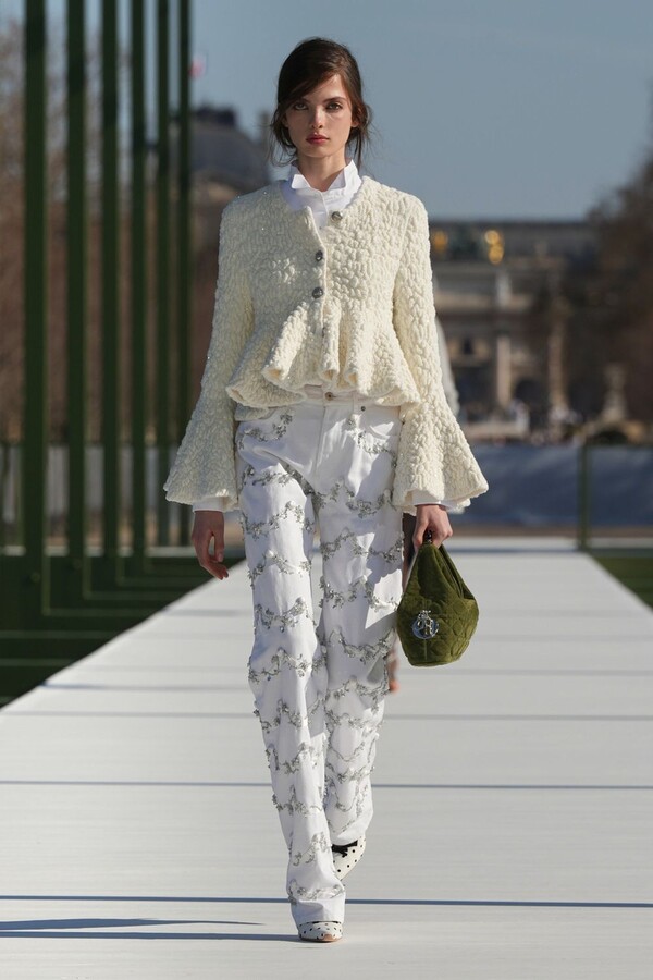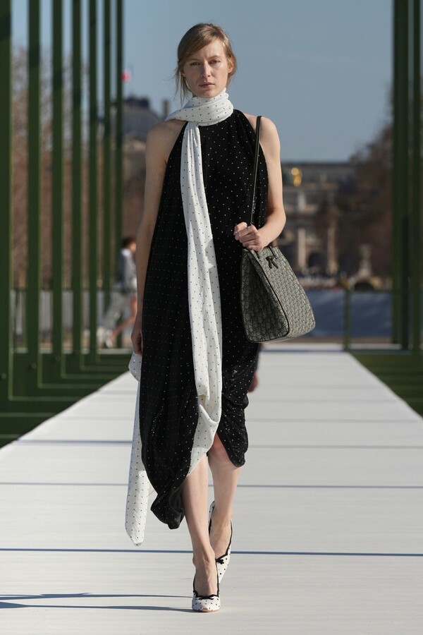 ومن القطع اللافتة تنورة من قماش Dotted Swiss مزودة بذيل طويل، بدت كتحية خفيفة لفستان Junon الشهير الذي ابتكره Christian Dior، لكن بنسخة أكثر خفة وانسياباً.