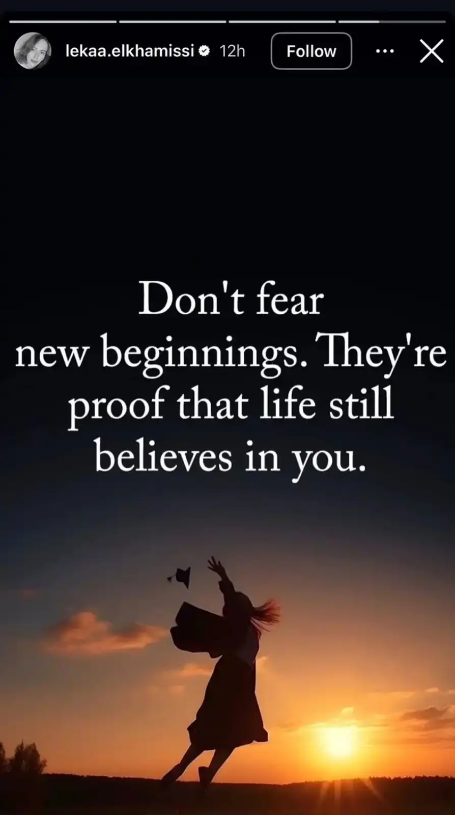 نشرت لقاء الخميسي رسالتها عبر خاصية "الستوري" على إنستغرام، وكتبت فيها: "لا تخف من البدايات الجديدة.. إنها دليل على أن الحياة لا تزال تؤمن بك".