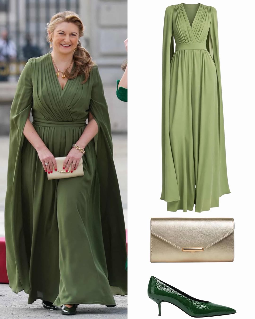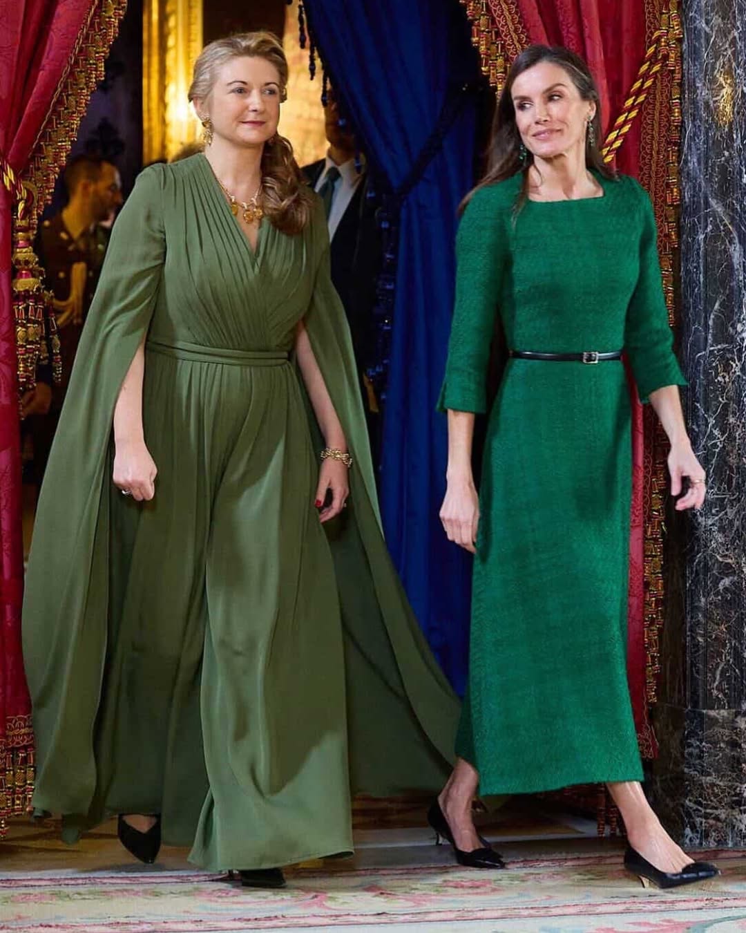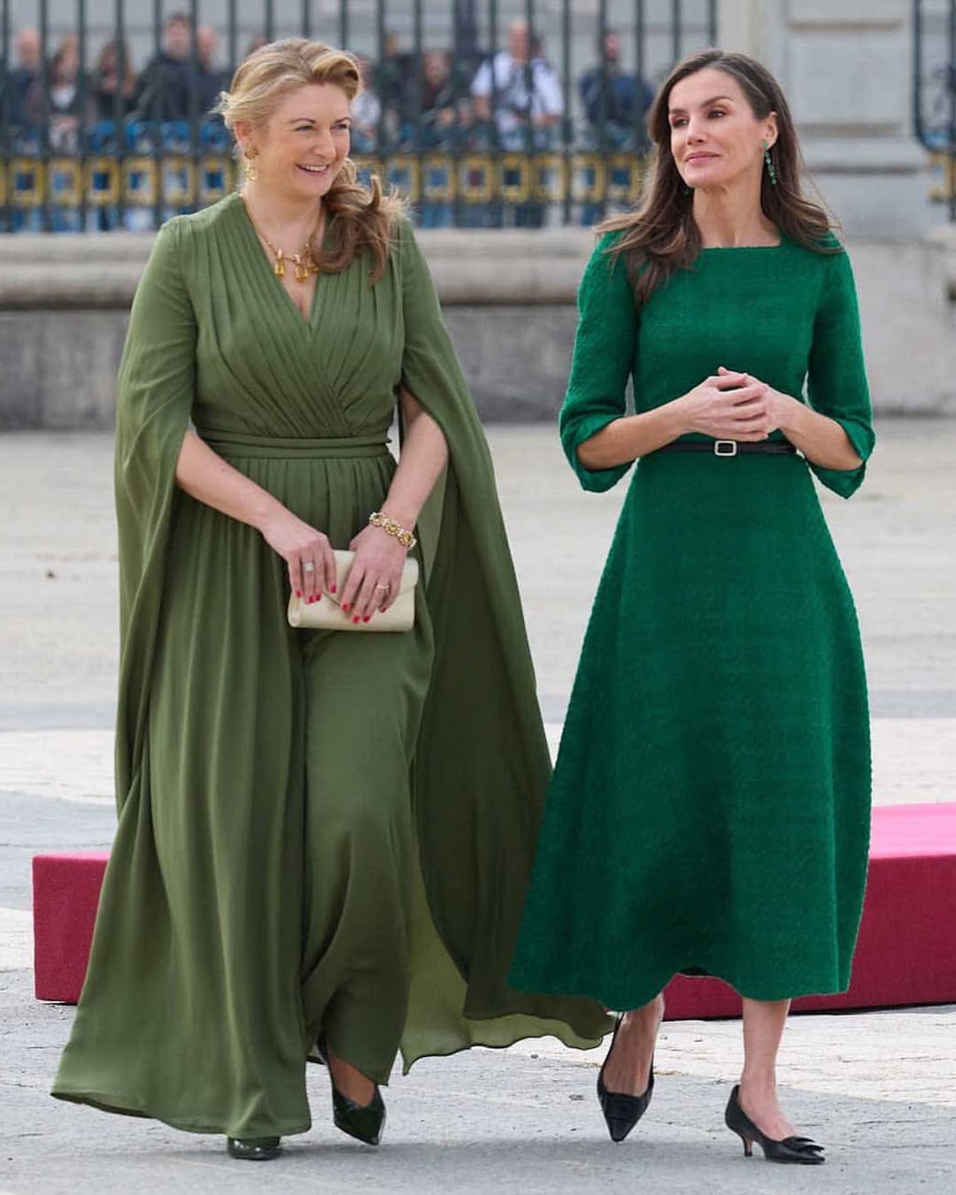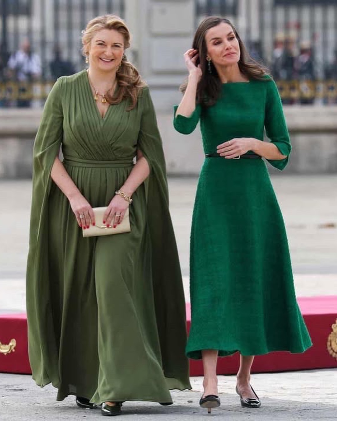 ولإحداث تباين لوني مشرق، حملت حقيبة "Lucy" الذهبية من علامة L.K.Bennett التي يبلغ سعرها 179 جنيهاً إسترلينياً، وهي أيضاً من القطع المفضلة لديها التي أعادت ارتداءها لتتناغم مع تفاصيل عقدها الذهبي الضخم، مما خلق توازناً بصرياً مبهراً بين اللونين الأخضر والذهبي تحت أضواء القصر الملكي الإسباني.