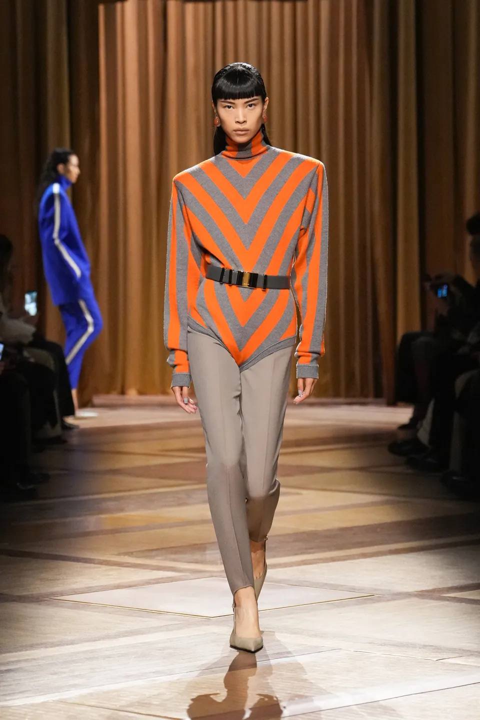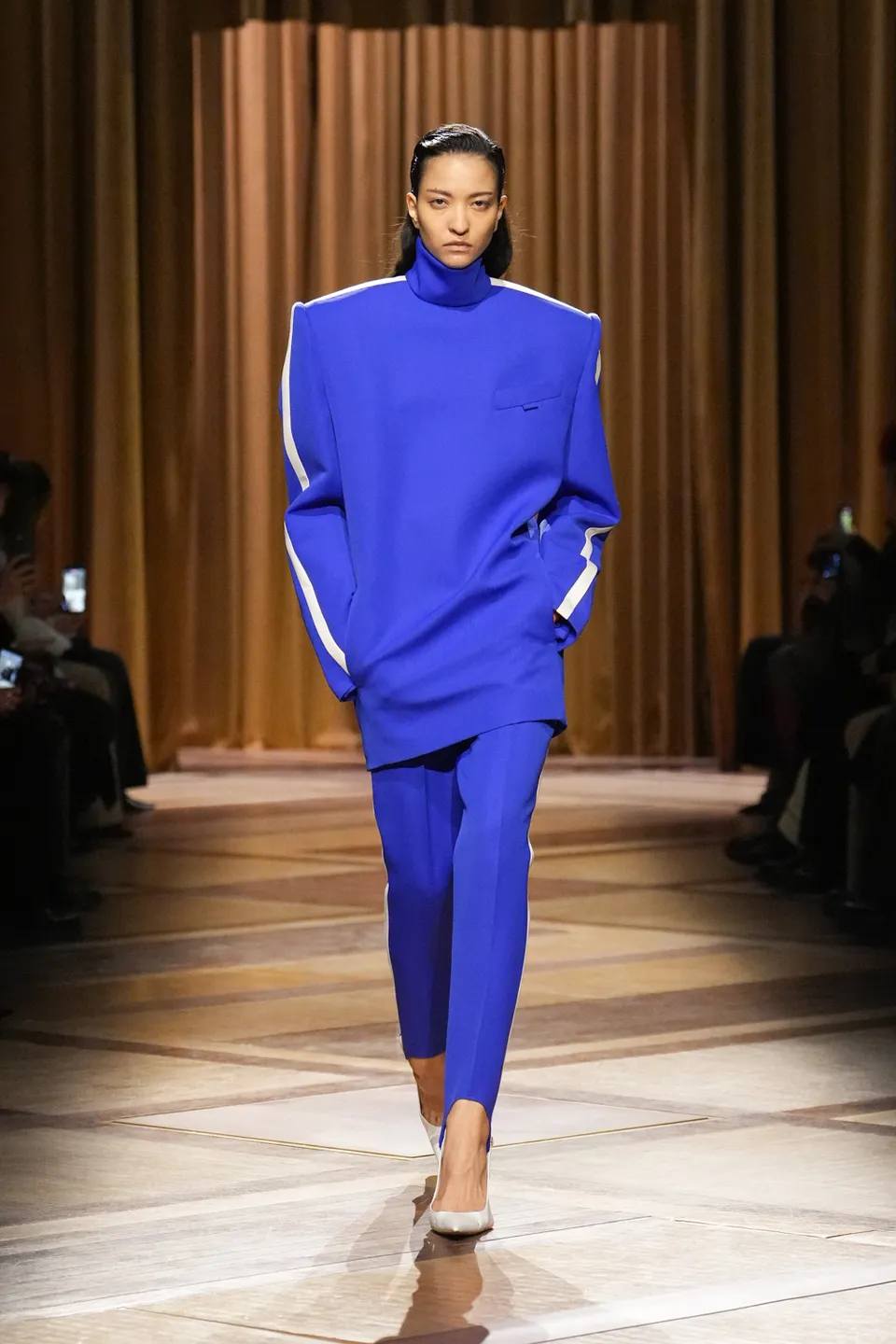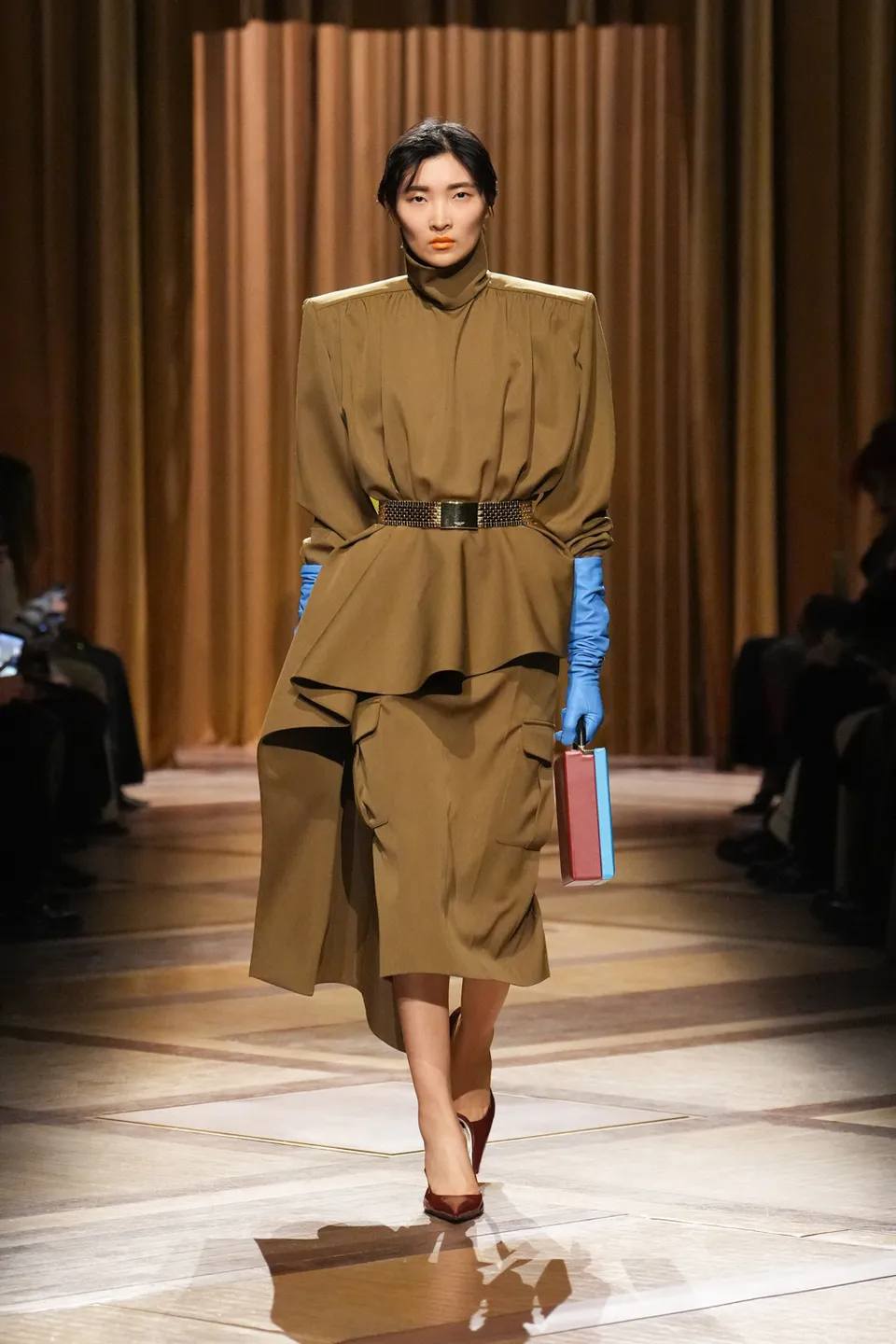 سيطر الأسود الفحمي والأزرق الكهربائي على منصة العرض، مع تداخلات جريئة من اللون الأرجواني العميق (Plum). كان التباين بين الأقمشة الشفافة (Sheer) والأجزاء المعدنية الصلبة يعكس صراع القوة والنعومة، وهو المحور الذي تدور حوله امرأة موغلر دائماً.