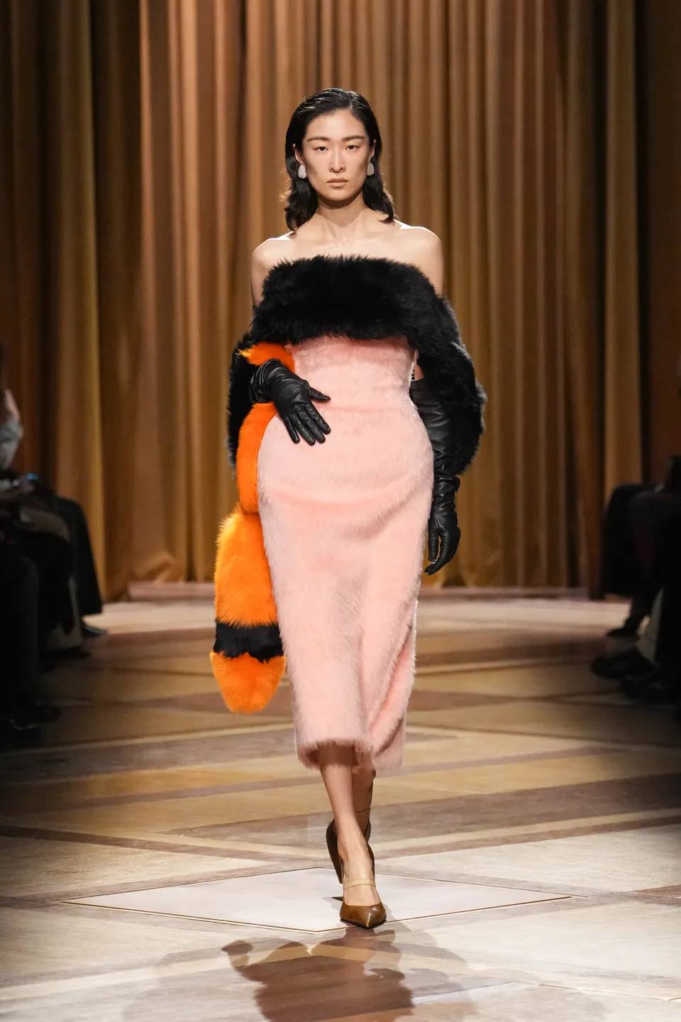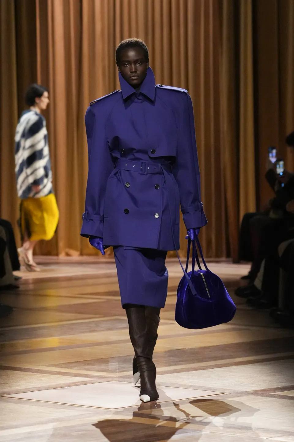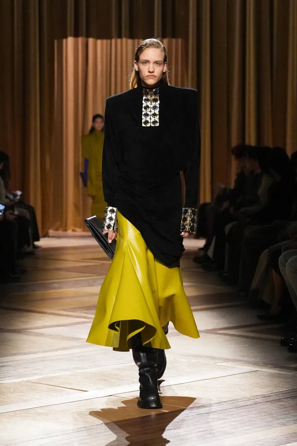 سيطر الأسود الفحمي والأزرق الكهربائي على منصة العرض، مع تداخلات جريئة من اللون الأرجواني العميق (Plum). كان التباين بين الأقمشة الشفافة (Sheer) والأجزاء المعدنية الصلبة يعكس صراع القوة والنعومة، وهو المحور الذي تدور حوله امرأة موغلر دائماً.