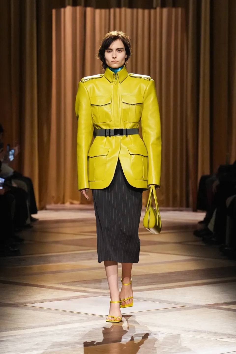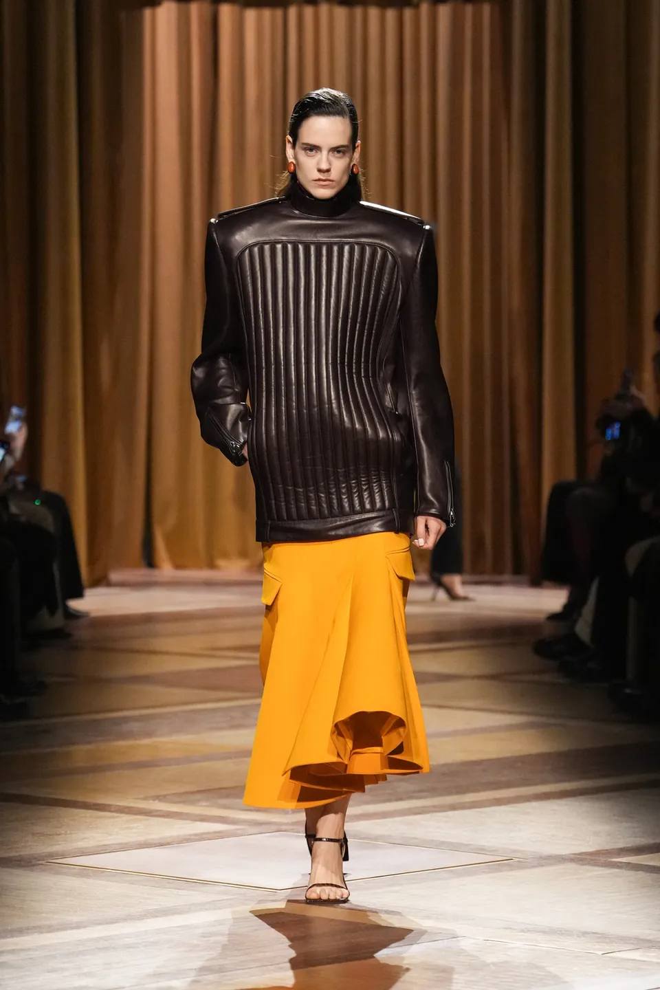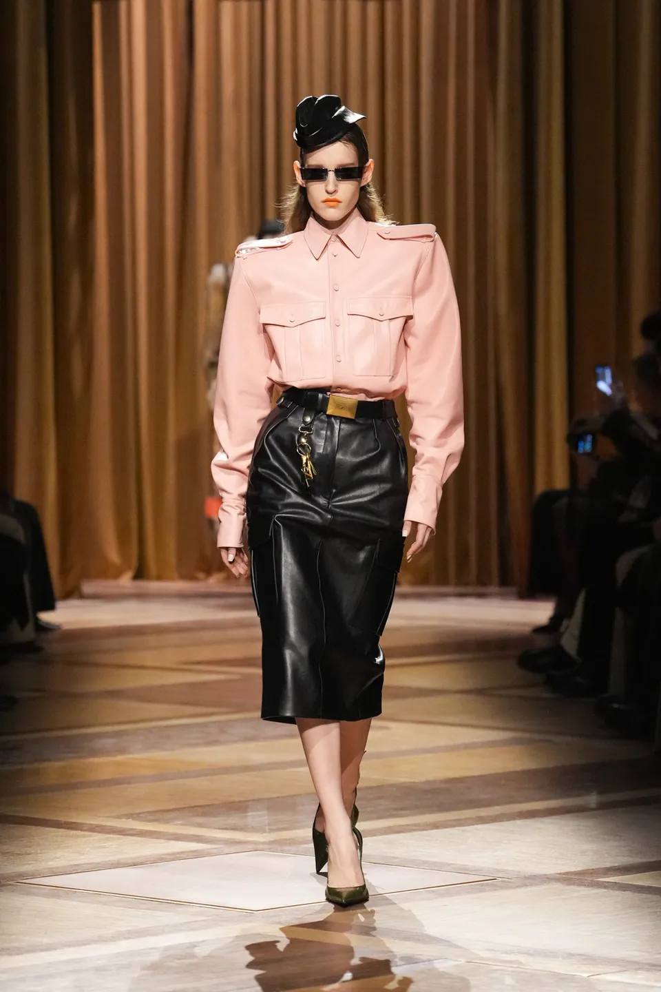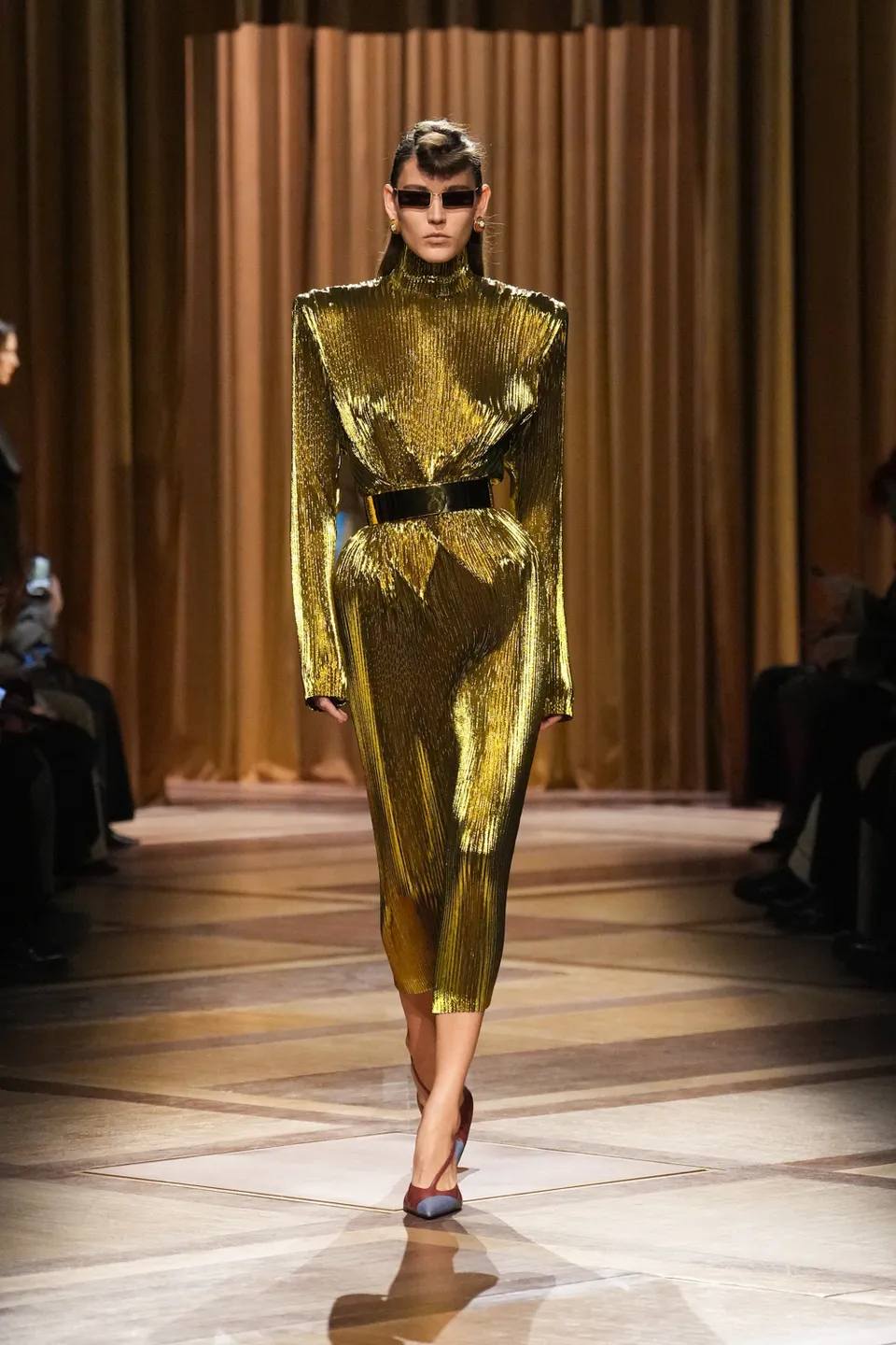 اعتمدت المجموعة بشكل أساسي على الأكتاف الحادة والخصر المنحوت، وهي العلامة المسجلة للراحل تيري موغلر، لكن بتحديثات تقنية مذهلة. رأينا استخداماً واسعاً لأقمشة "النيوبرين" المعاد تدويرها وجلوداً معالجة بالليزر تعطي انطباعاً بأن الملابس جزء من تكوين الجسد وليست مجرد غطاء له.
