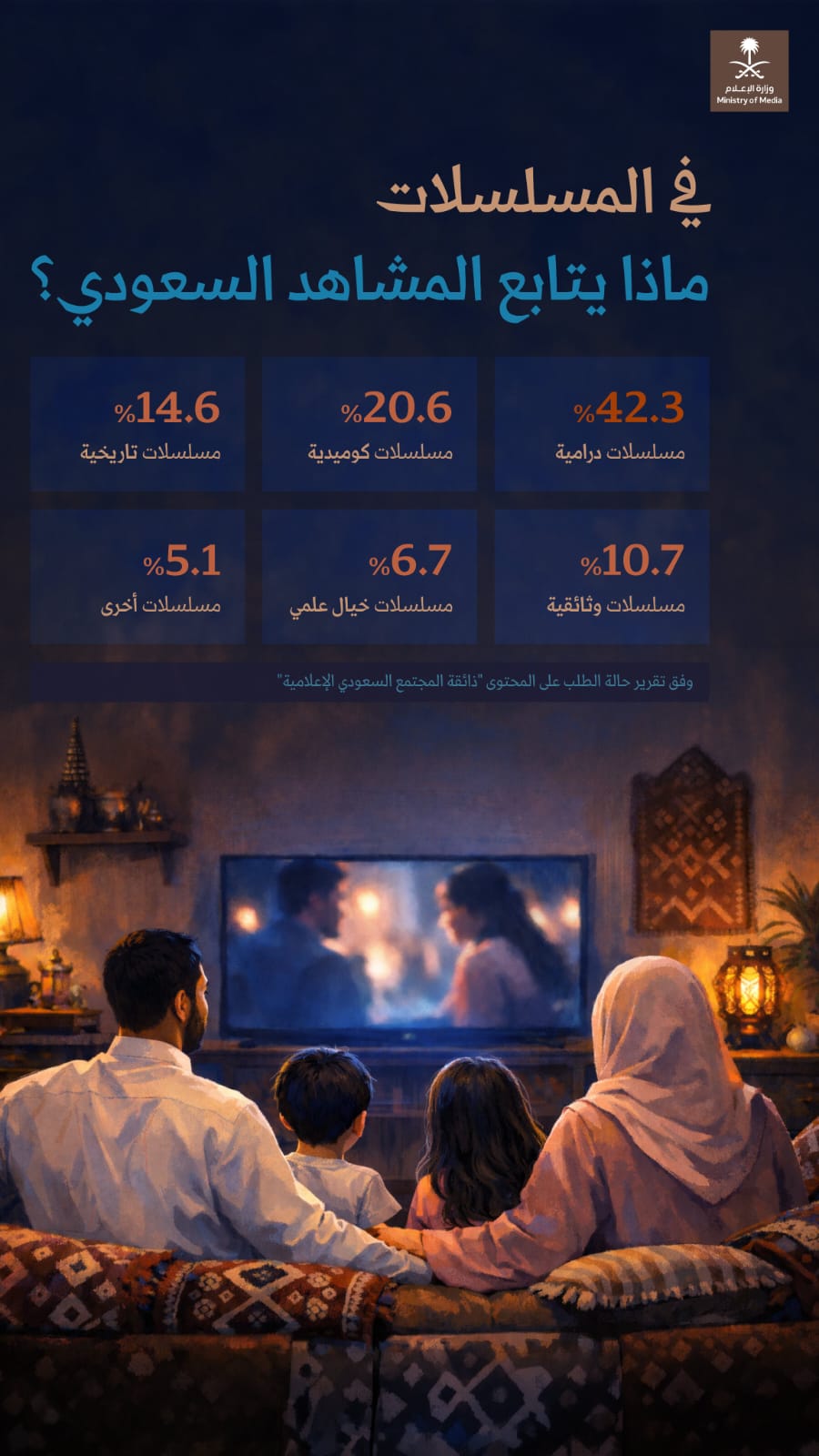 كشف تقرير حديث صادر عن وزارة الإعلام السعودية، ضمن دراسة حول "ذائقة المجتمع السعودي الإعلامية"، عن تصدر المسلسلات الدرامية قائمة اهتمامات المشاهدين في المملكة بفارق كبير عن بقية القوالب الفنية الأخرى، مما يعكس توجهاً مجتمعياً نحو القصص الاجتماعية والإنسانية.