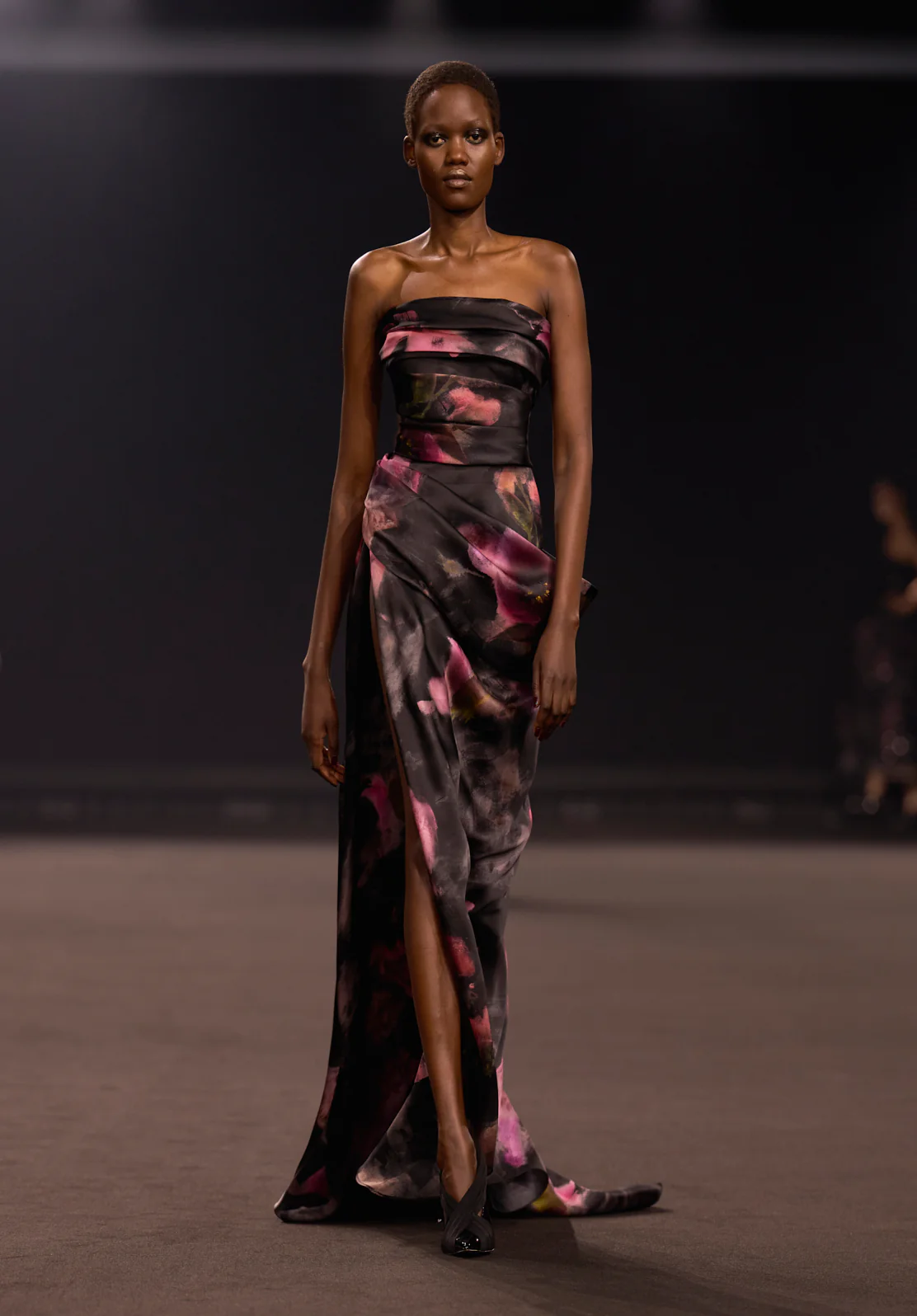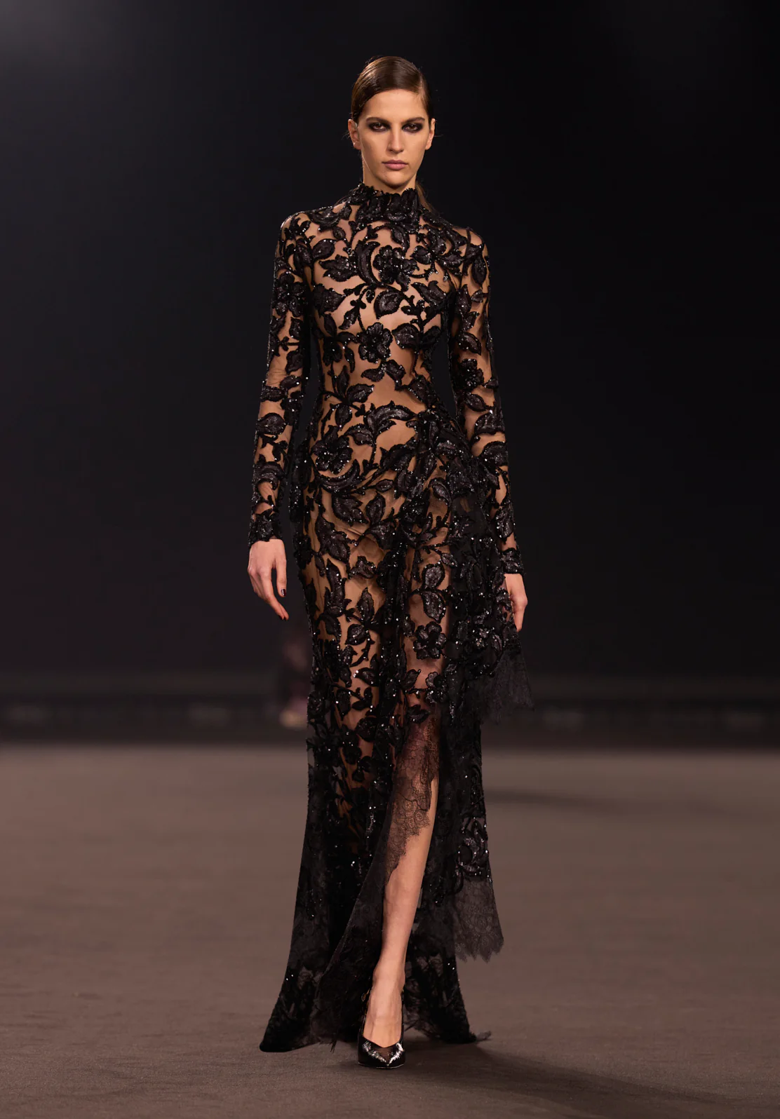 حين يحل المساء، تتحول امرأة إيلي صعب إلى ملهمة درامية لفنان معاصر. تنساب أقمشة الأورجانزا والشيفون على الجسد بنعومة، وكأنها نُسجت بأسلوب ارتجالي مباشر على "المانيكان". تبرز الزهور المورقة المرسومة يدوياً على الجلد اللامع، لتعيد إلى الأذهان ضربات فرشاة الفنان العالمي "ساي تومبلي" (Cy Twombly) الساحرة.