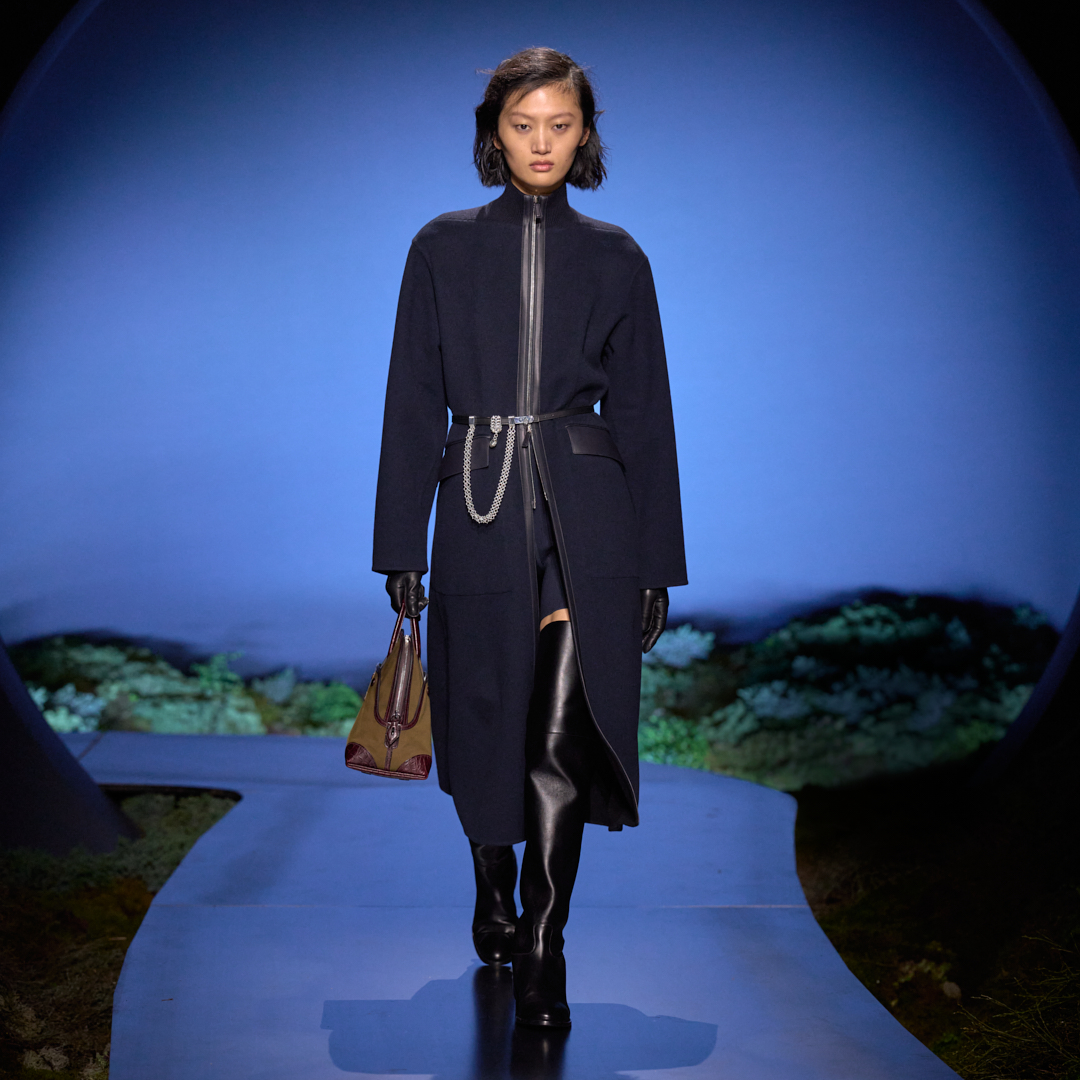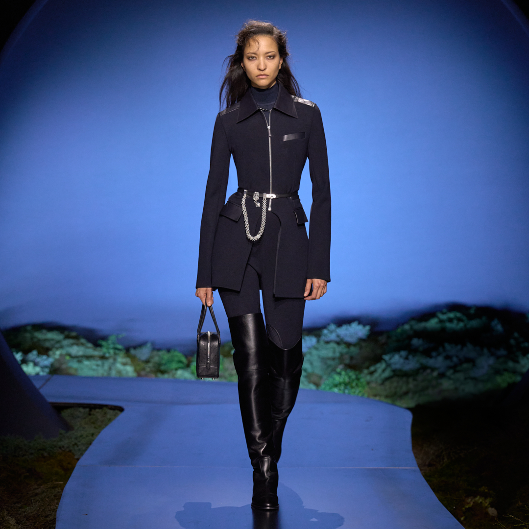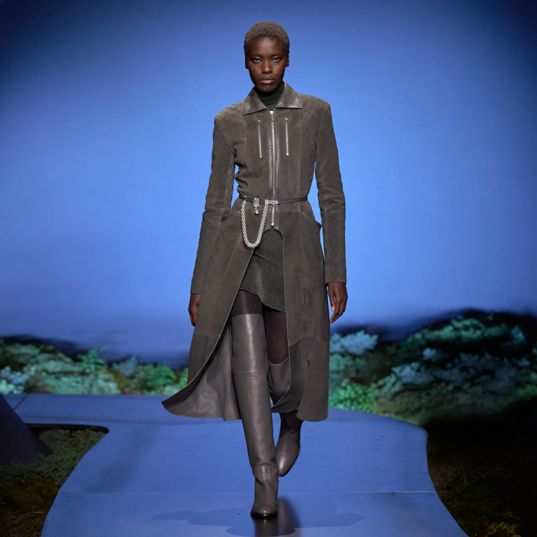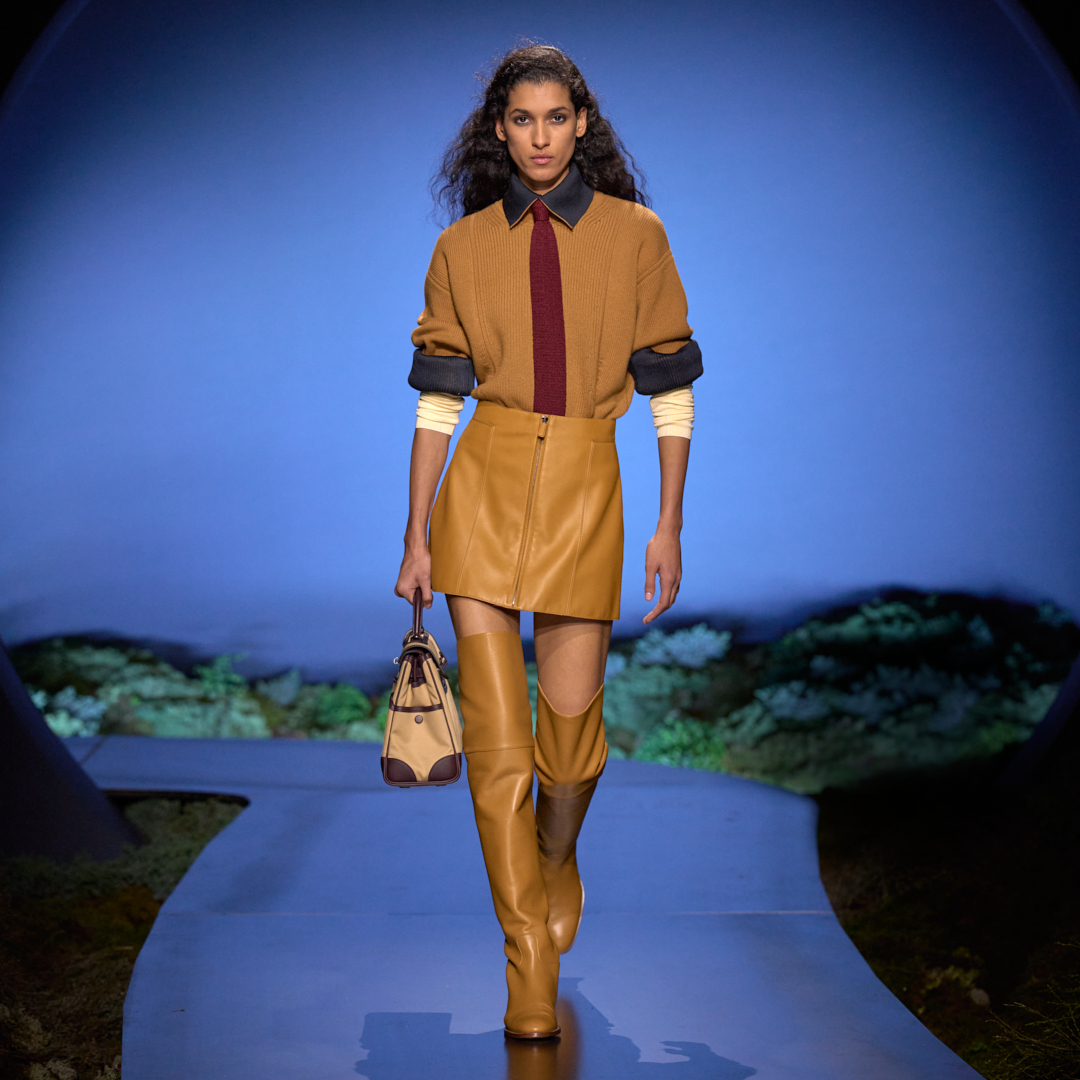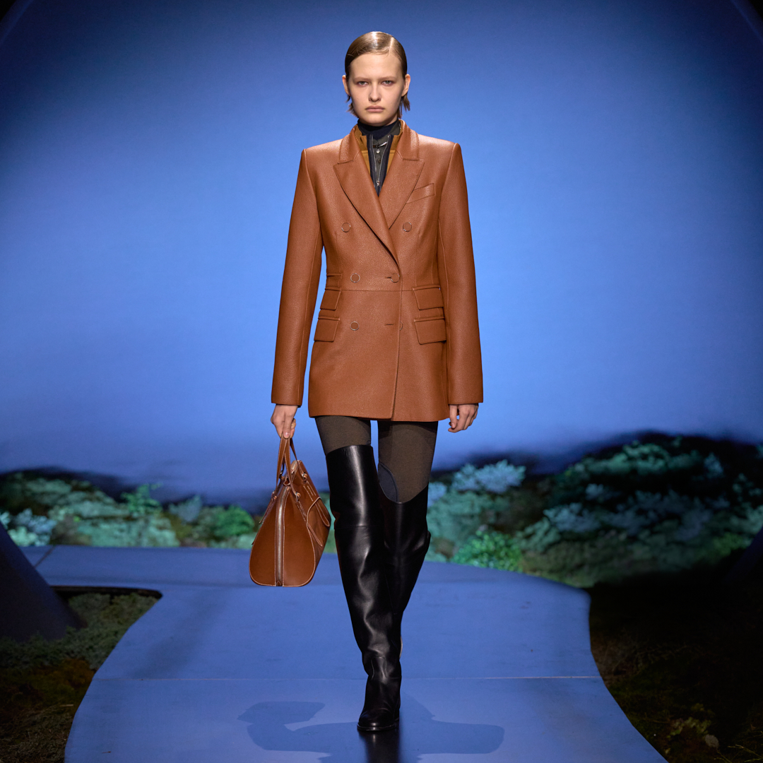 لم تكن المجموعة مجرد أزياء، بل كانت "عدّة" كاملة للمرأة التي تنشد الحرية في الطبيعة الخلوية؛ فرأينا معاطف الجلد الناعمة بجيوبها الأربعة المستوحاة من النمط العسكري، وسراويل "Salopettes" المخصصة للتسلق، بالإضافة إلى بنطلونات الركوب (Jodhpurs) التي تعد بصمة تاريخية للدار.