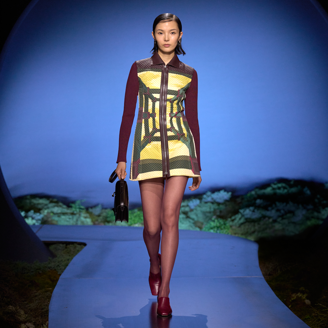 استدعت المجموعة أصداء الستينات وقوة حركة الـ "Youthquake" من خلال قصات الـ "A-line" والتنانير القصيرة ذات الطابع الجامعي، والتي نُسقت بذكاء مع ربطات العنق والكنزات ذات الياقات المدببة. ولم يكتفِ العرض بالقصات، بل ضخّ حيوية تلك الحقبة عبر لوحة ألوان غنية تضمنت الأخضر الداكن، الأصفر الذرّي، والبرغندي، والتي ظهرت بوضوح في الجوارب الملونة التي أضفت لمسة شبابية متمرّدة على كلاسيكية الجلد.