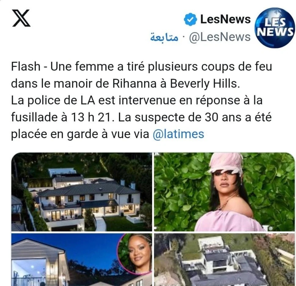 تعرضت النجمة العالمية Rihanna لحادث مقلق داخل منزلها الفخم في منطقة Beverly Hills، بعدما أقدمت امرأة في الثلاثينيات من عمرها على إطلاق النار باتجاه القصر الذي تقيم فيه. وقد أثارت الواقعة حالة من الصدمة والقلق بين متابعي الفنانة حول العالم، خاصة مع وجودها داخل المنزل وقت الحادث.