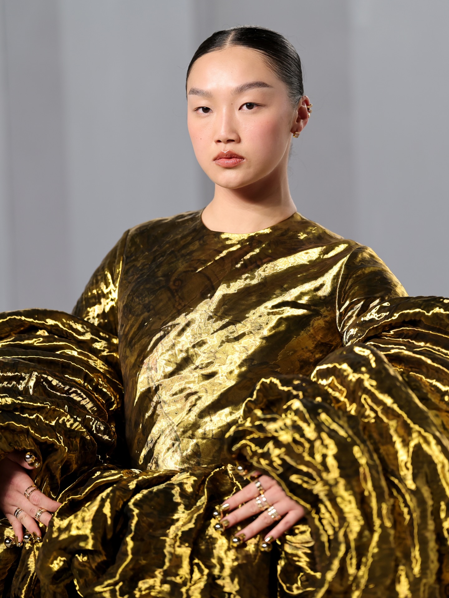 الوصف: بأسلوب يدمج بين الفن المفاهيمي والموضة، أطلت نجمة "K-Pop Demon Hunters" بقناع وتصميم من Maison Margiela، محولةً السجادة الحمراء إلى لوحة سريالية غامضة ومبتكرة.