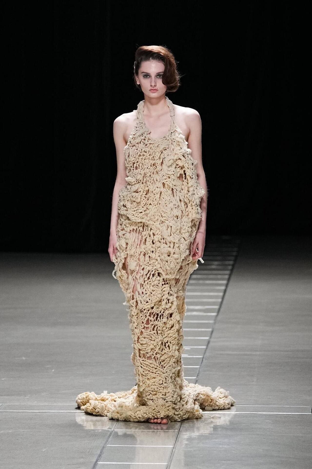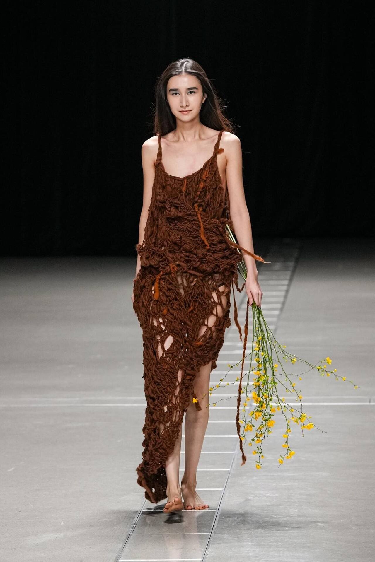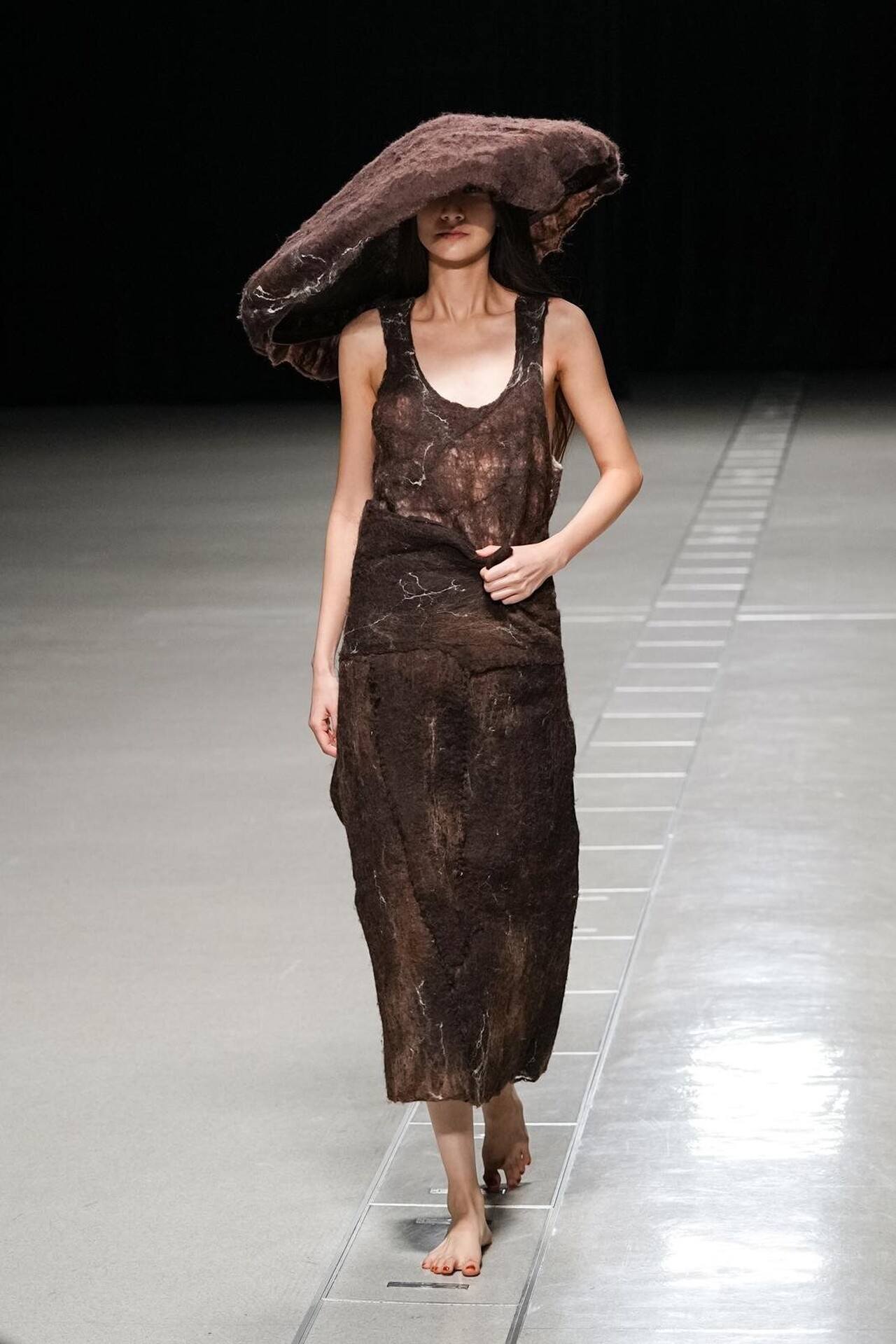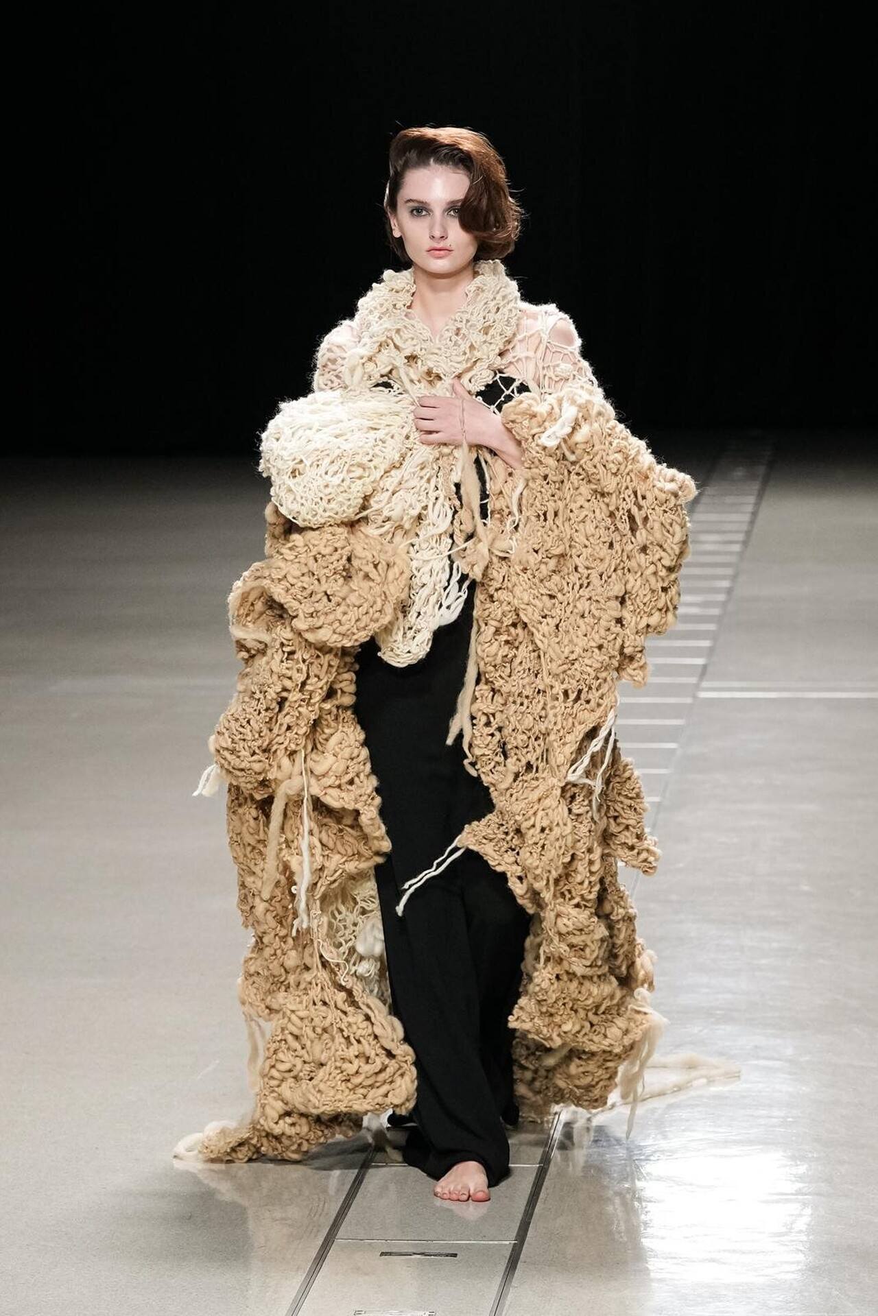 بدأ العرض بمفاجأة بصرية؛ عارضات حافيات الأقدام. كانت هذه الحركة بمثابة رفض صريح لـ "الدروع" التقليدية التي تفرضها الموضة الرسمية، ووضع المشاهد في مواجهة مباشرة مع الأرض. هذا التمهيد سمح لطبقات المحبوكات المغزولة يدوياً (Handspun Knits) أن تبرز كبشرة ثانية للجسد، تؤكد على حركته وانسيابيته بدلاً من إخفائه.