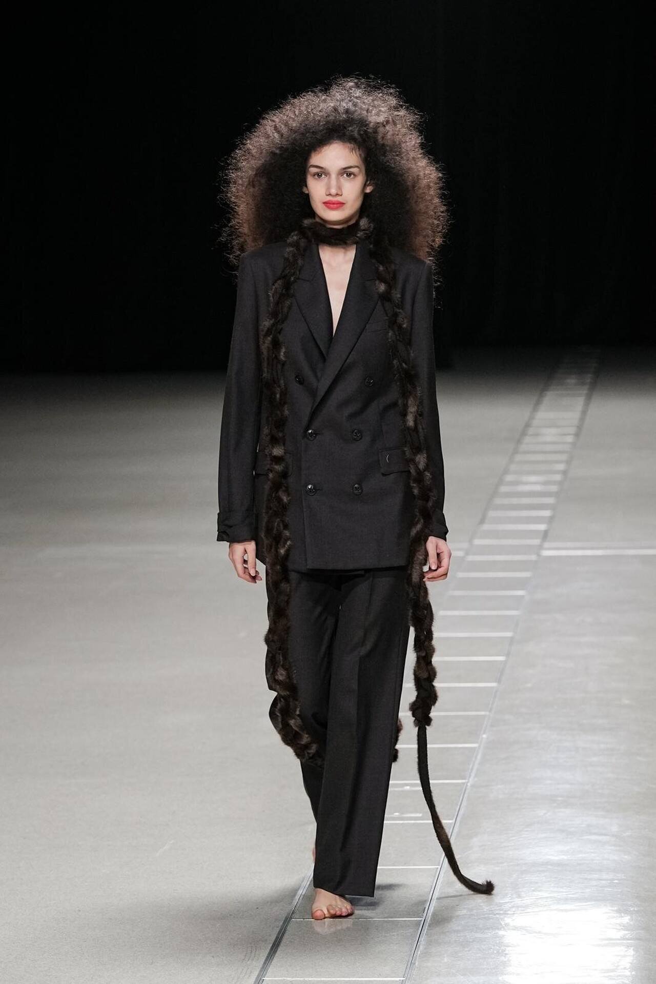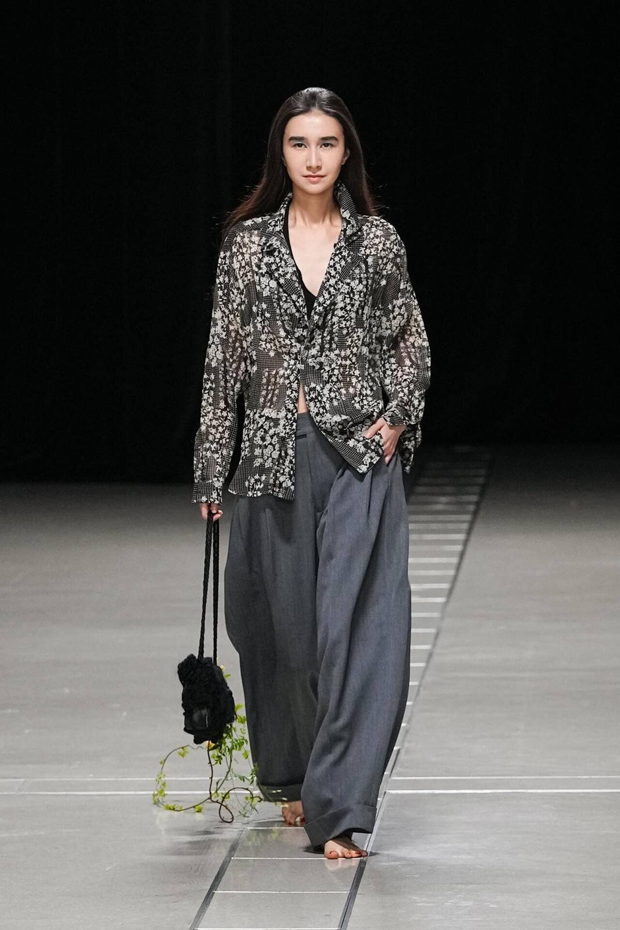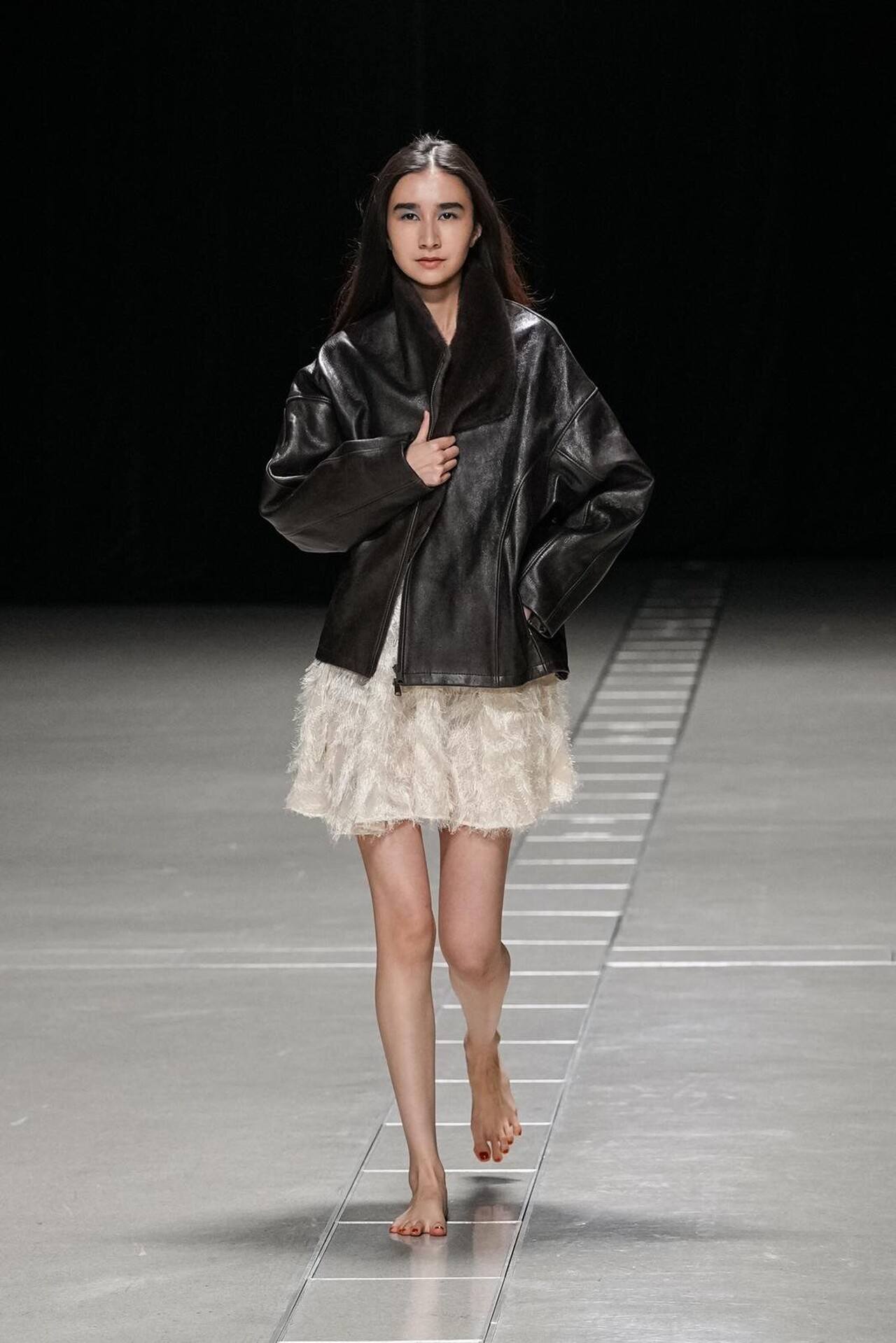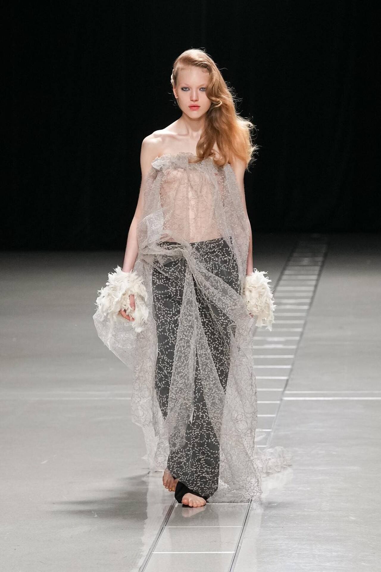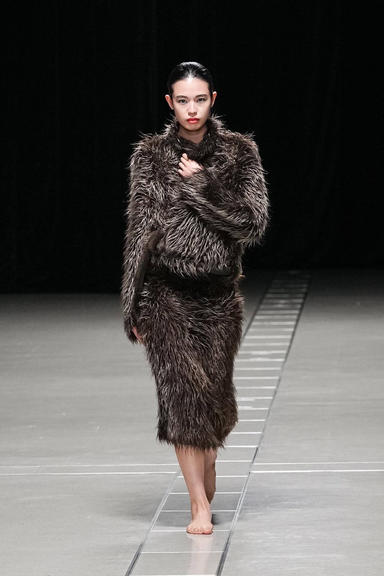 بدأ العرض بمفاجأة بصرية؛ عارضات حافيات الأقدام. كانت هذه الحركة بمثابة رفض صريح لـ "الدروع" التقليدية التي تفرضها الموضة الرسمية، ووضع المشاهد في مواجهة مباشرة مع الأرض. هذا التمهيد سمح لطبقات المحبوكات المغزولة يدوياً (Handspun Knits) أن تبرز كبشرة ثانية للجسد، تؤكد على حركته وانسيابيته بدلاً من إخفائه.