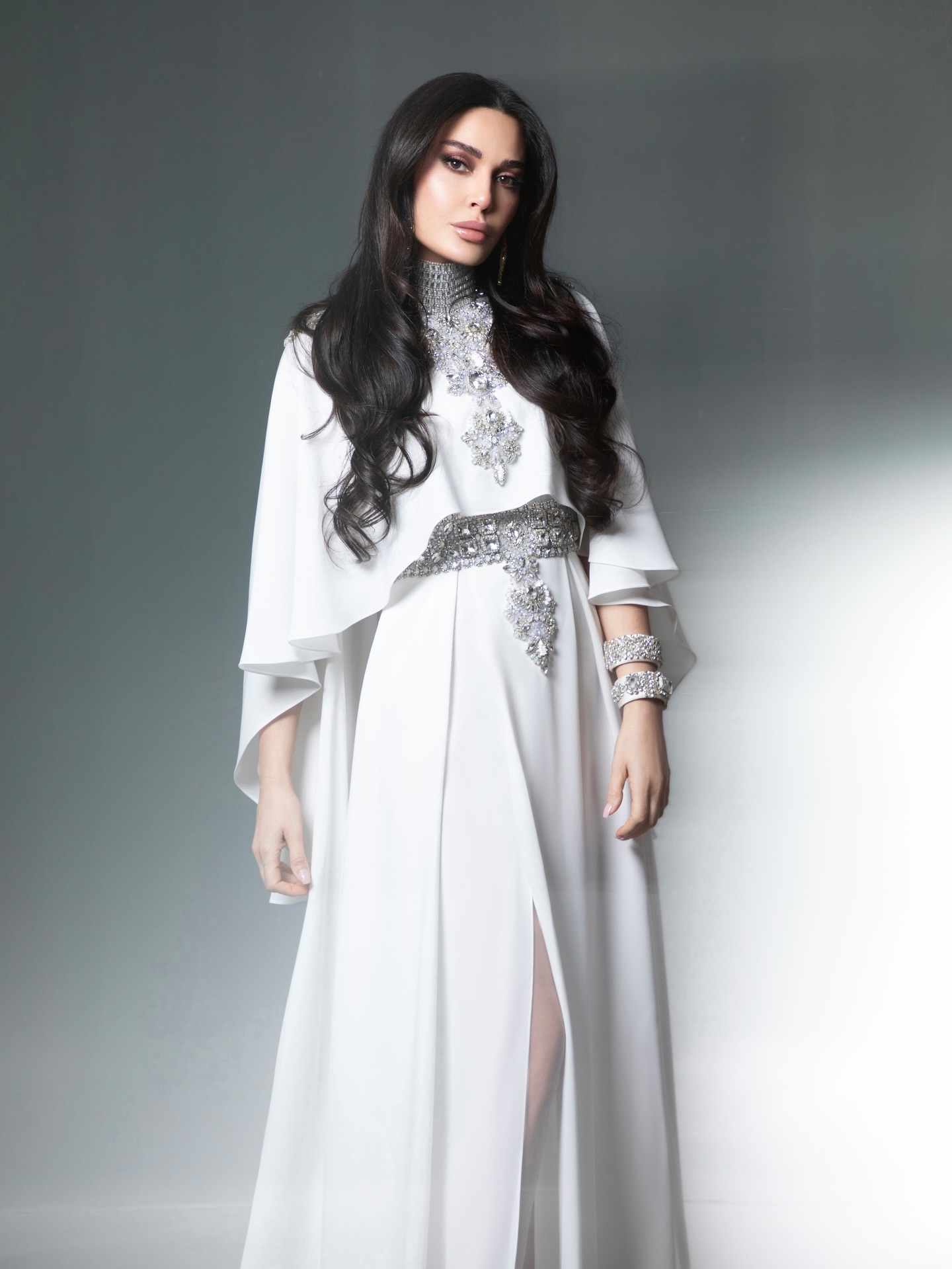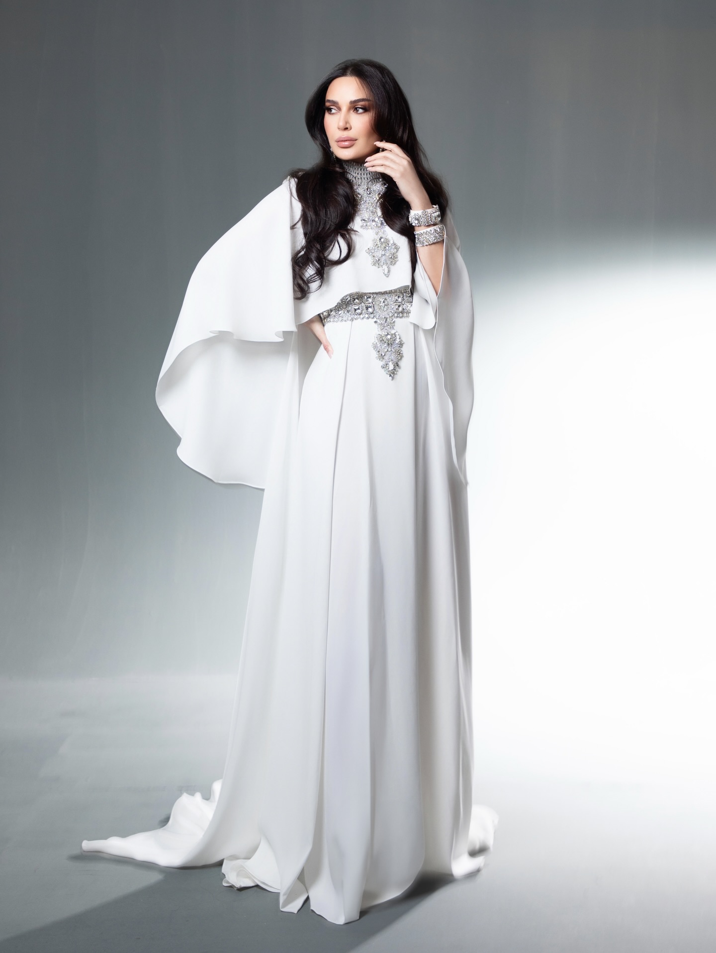 تميّزت العباءة بقصّة فضفاضة تنسدل بانسيابية راقية، مع كاب قصير يغطي الكتفين ويضفي بُعداً درامياً ناعماً على الإطلالة. كما برزت الياقة العالية المرصّعة بالتفاصيل اللامعة، لتشكّل إطاراً أنيقاً للوجه وتمنح التصميم حضوراً ملكياً هادئاً.